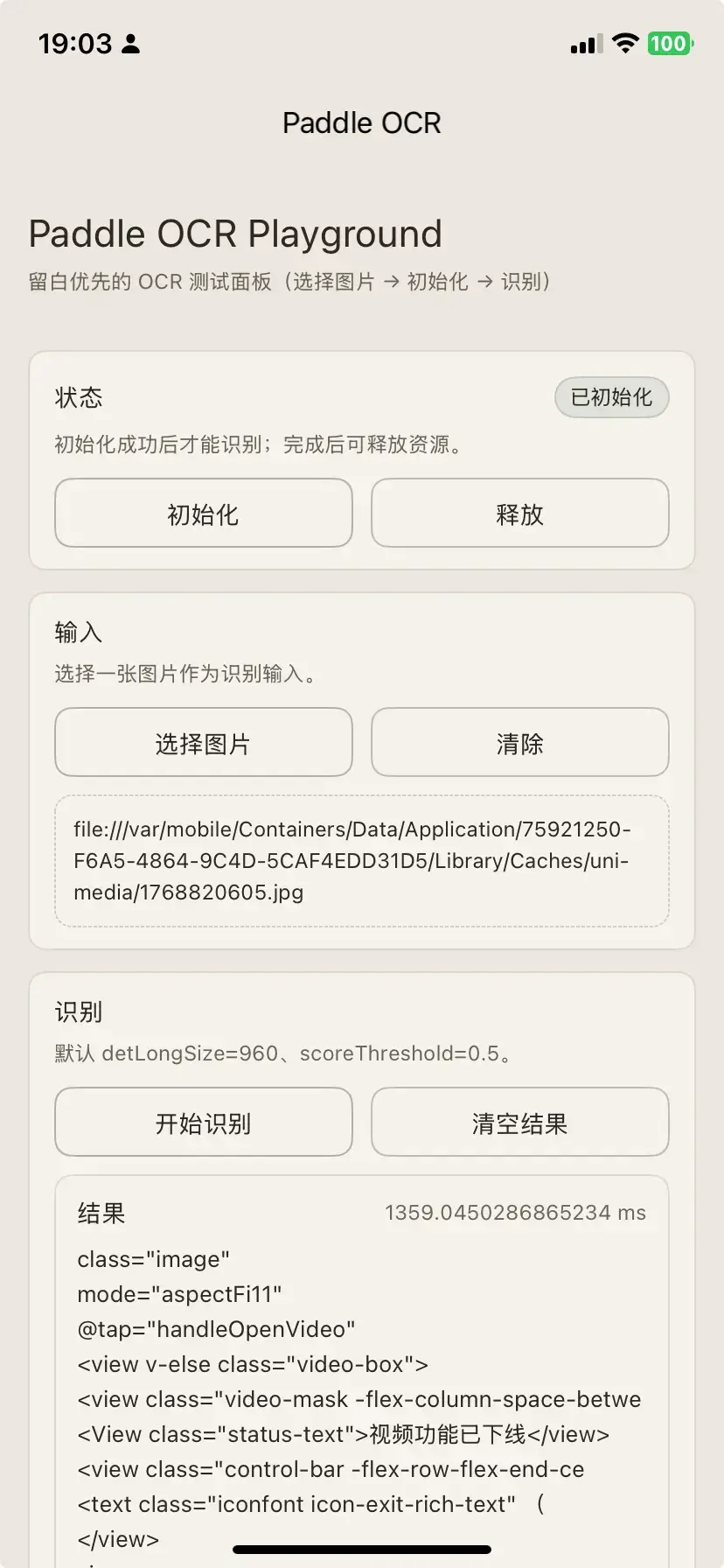 initPaddleOcr再recognizePaddleOcr;不用时调用releasePaddleOcr - 仅支持本地图片(不支持直接传网络 URL);可配合