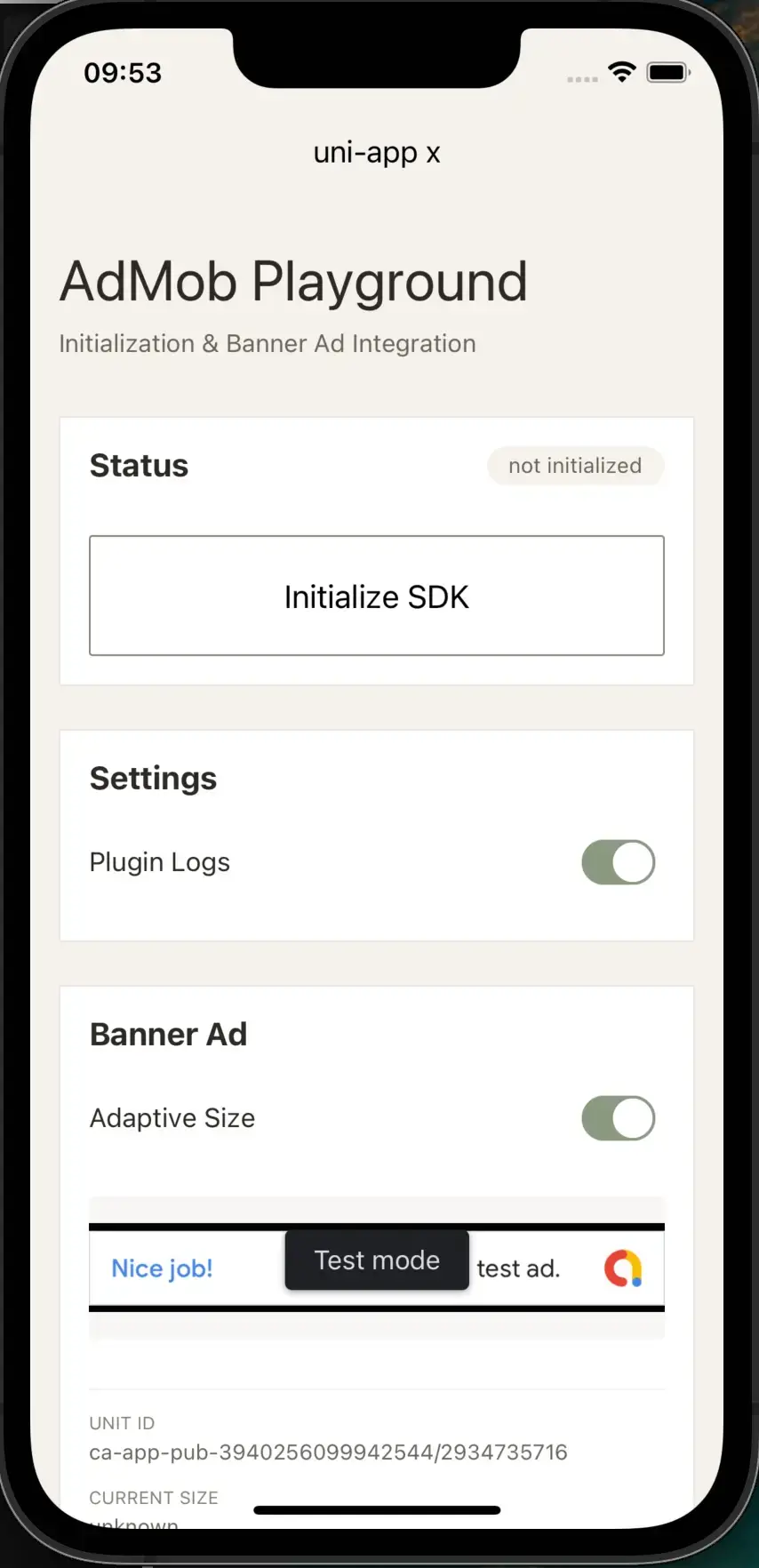 uni_modules/hans-admob-banner放到你的项目uni_modules/下(从插件市场安装也会自动放到这里) - 在 App 启动阶段调用一次