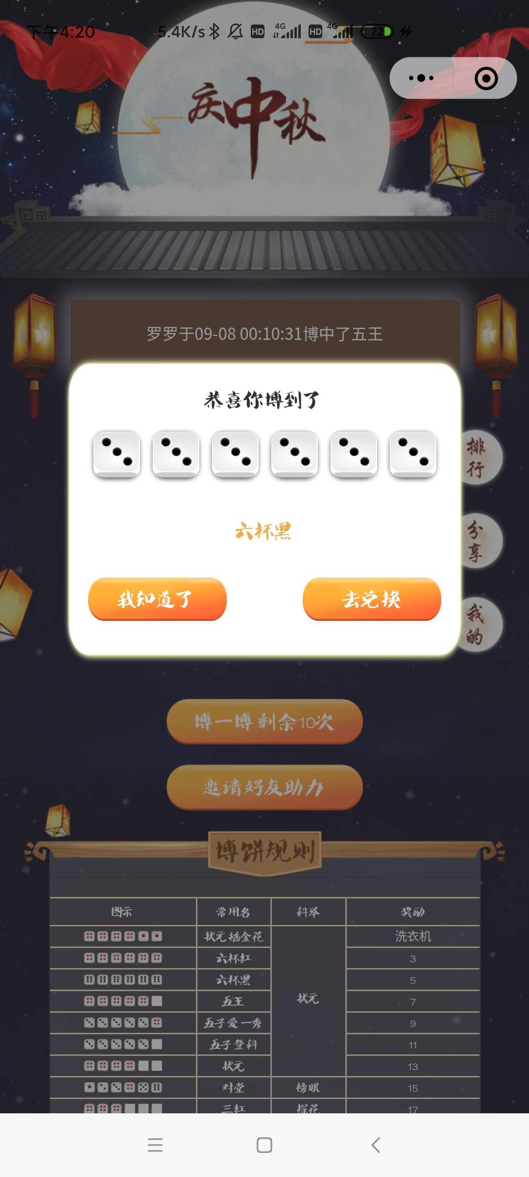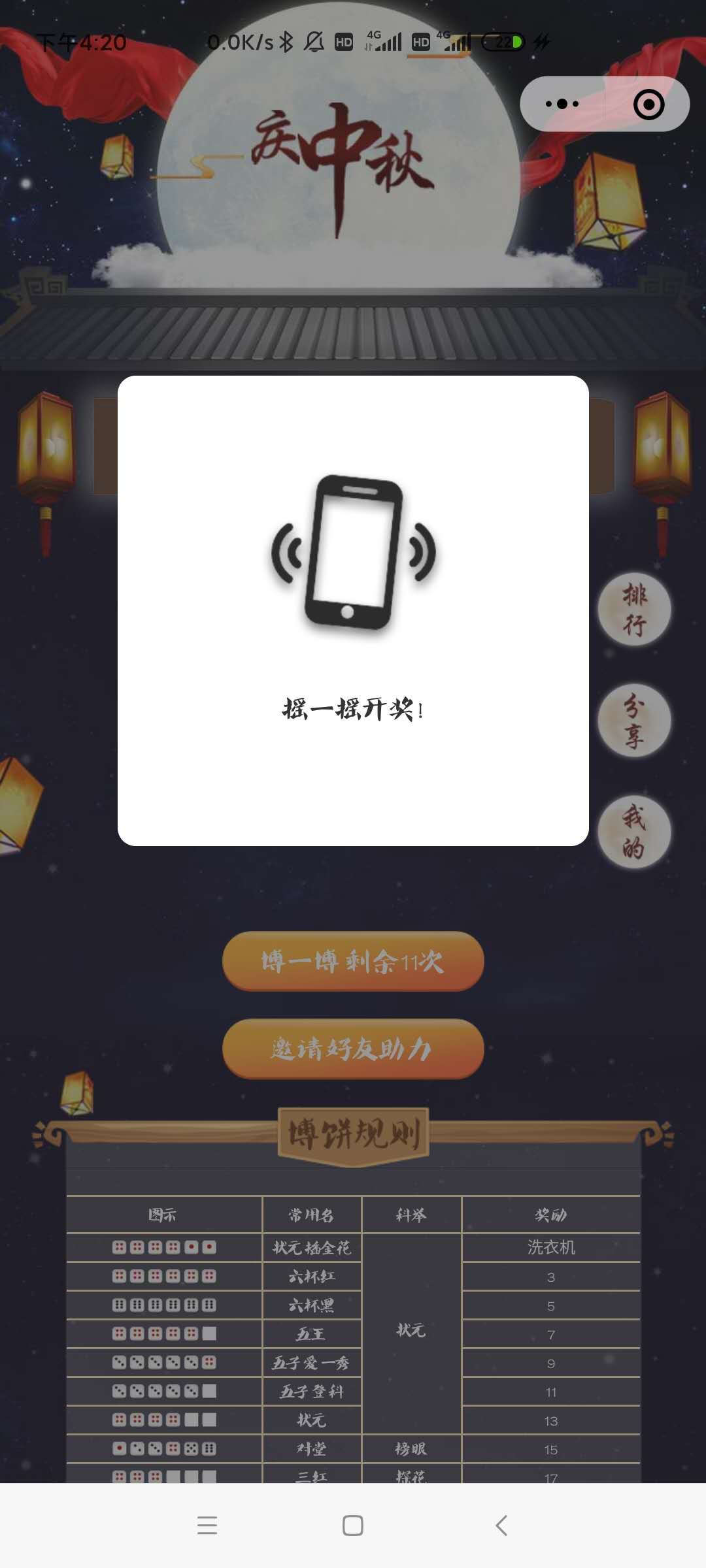 1.博饼是闽南一带的庆中秋玩法,所以在配音上采用了闽南语 2.默认采用摇一摇,然后开始博饼。如果5秒内没摇,则自动开奖 3.本系统采用一店一码