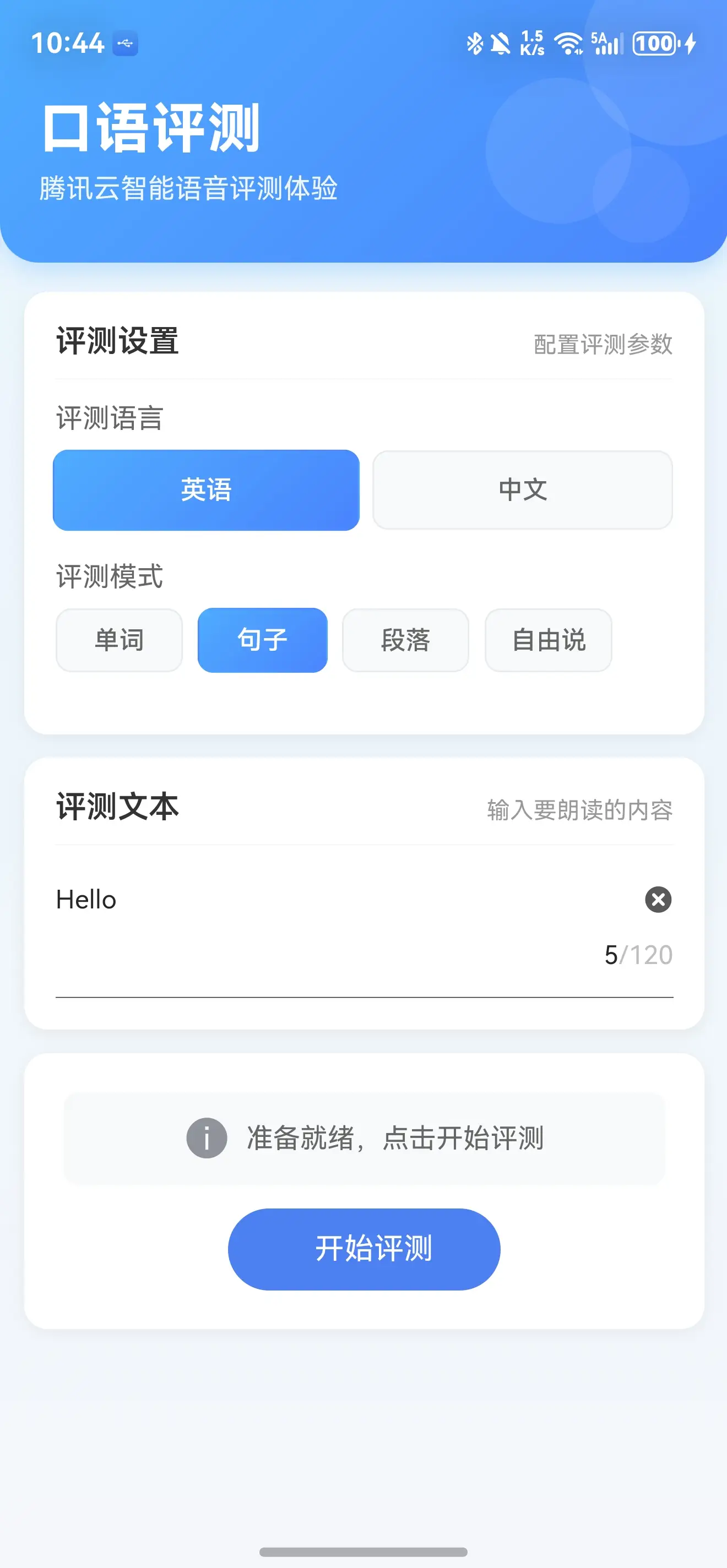 - 支持单词/句子/段落/自由说四种评测模式