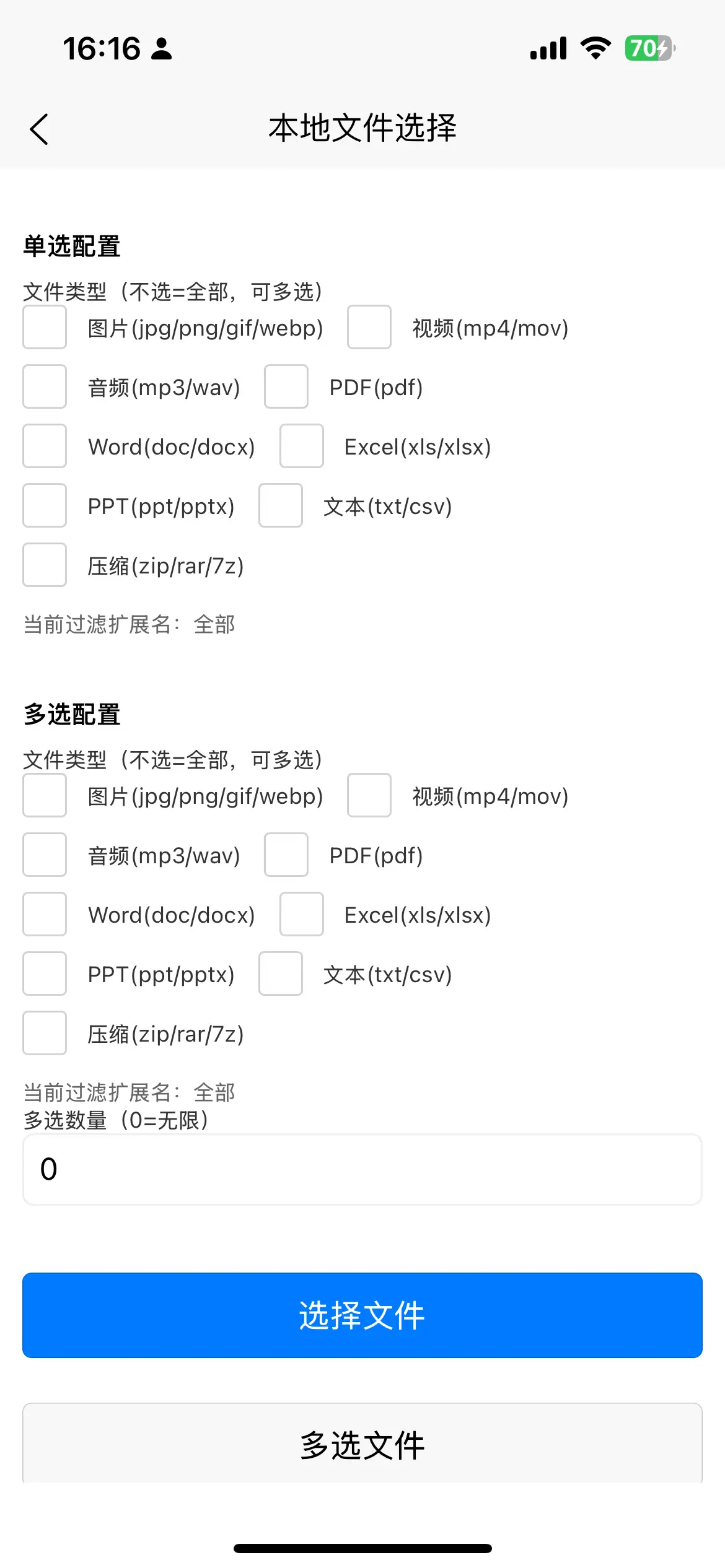 multiple:是否多选(默认false)maxCount:多选最大数量(<=0或不传表示不限制;仅multiple=true生效;iOS 系统选择器不支持 UI 侧限制数量,插件会在回调结果中截断/过滤)fileTypes:文件类型过滤(扩展名数组,不含点,如["pdf","png"];等价于extensions,优先级更高;Android 会尽量从扩展名推导 MIME 以限制系统选择器,但依然可能被用户选到其它类型,最终会在结果侧过滤)mimeTypes:MIME 过滤(主要用于 Android,如["image/*","application/pdf"];系统选择器过滤能力因 ROM/文件管理器不同而存在差异,插件会在结果侧做二次过滤;若过滤后为空会走fail回调并返回9012005)copyToCache:是否复制到缓存目录(默认true)