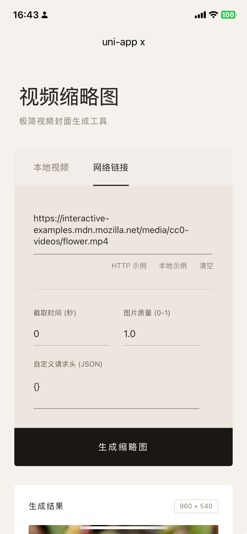 time:截帧时间(毫秒),默认0quality:0..1,默认1.0headers:远程 URL 请求头(可选,建议 value 使用字符串)