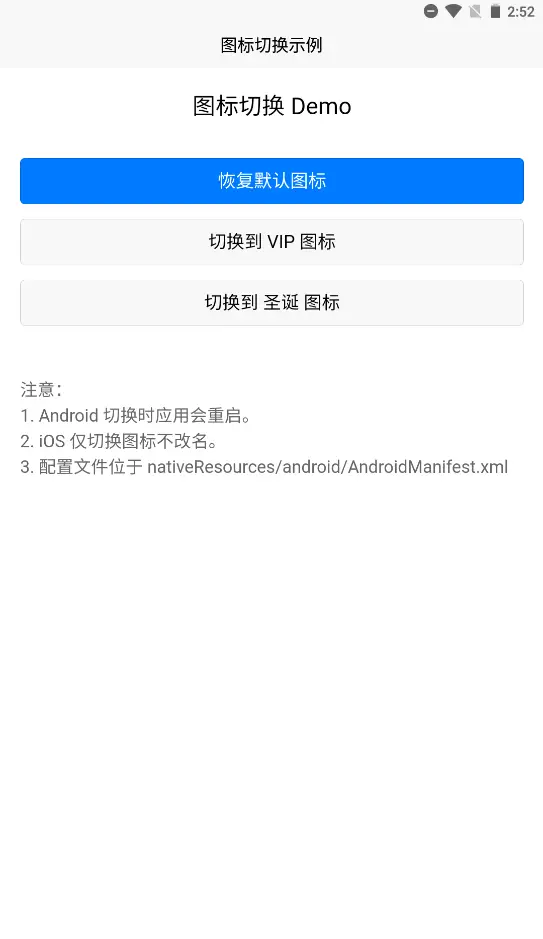 activity-alias,会导致应用重启,这是系统机制,无法避免。 - iOS: 系统限制无法修改应用名称,只能修改桌面图标。