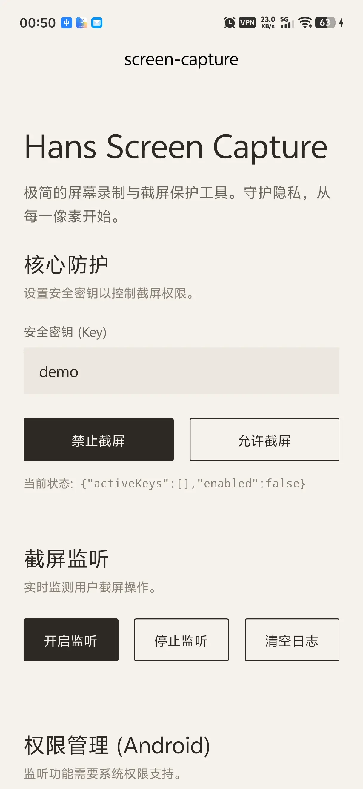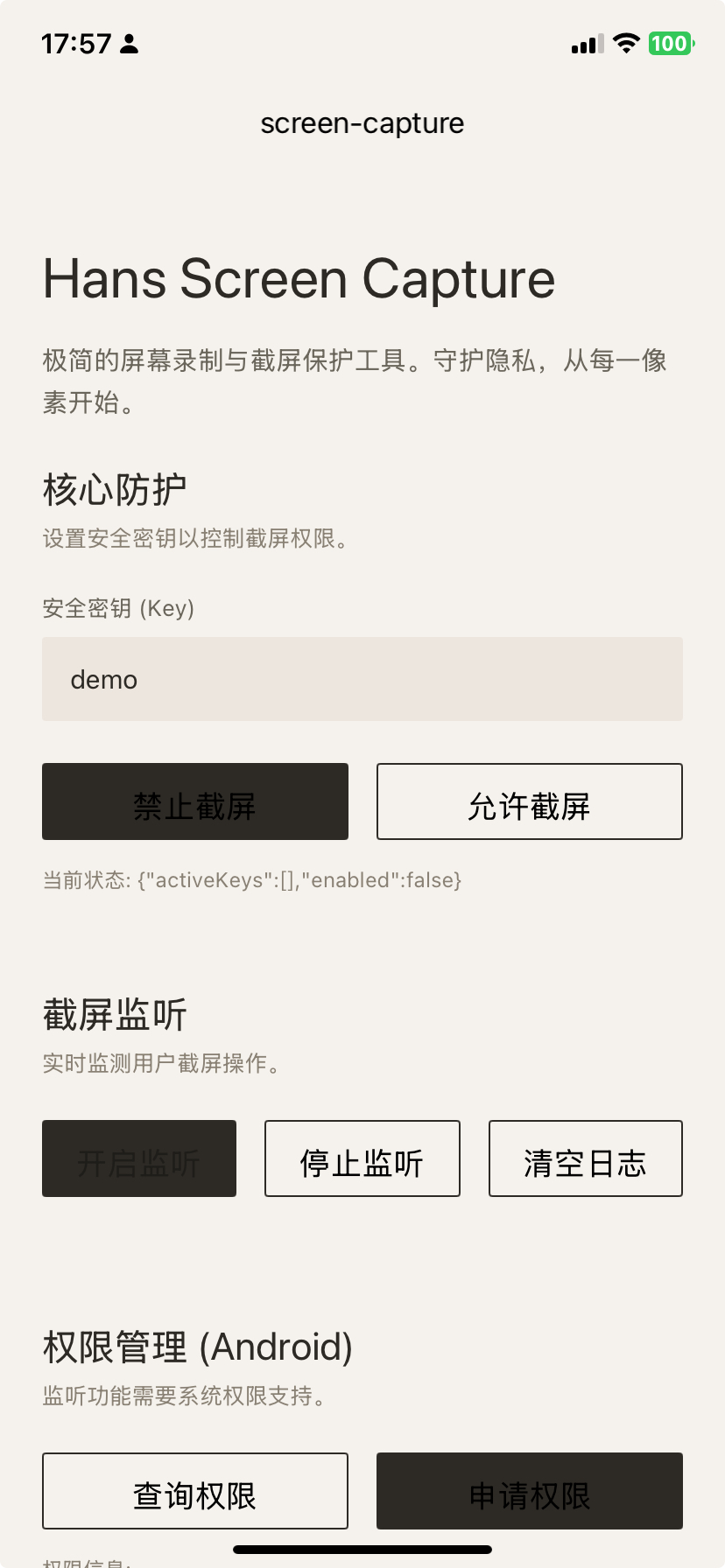 import { preventScreenCapture, allowScreenCapture } from '@/uni_modules/hans-screen-capture'