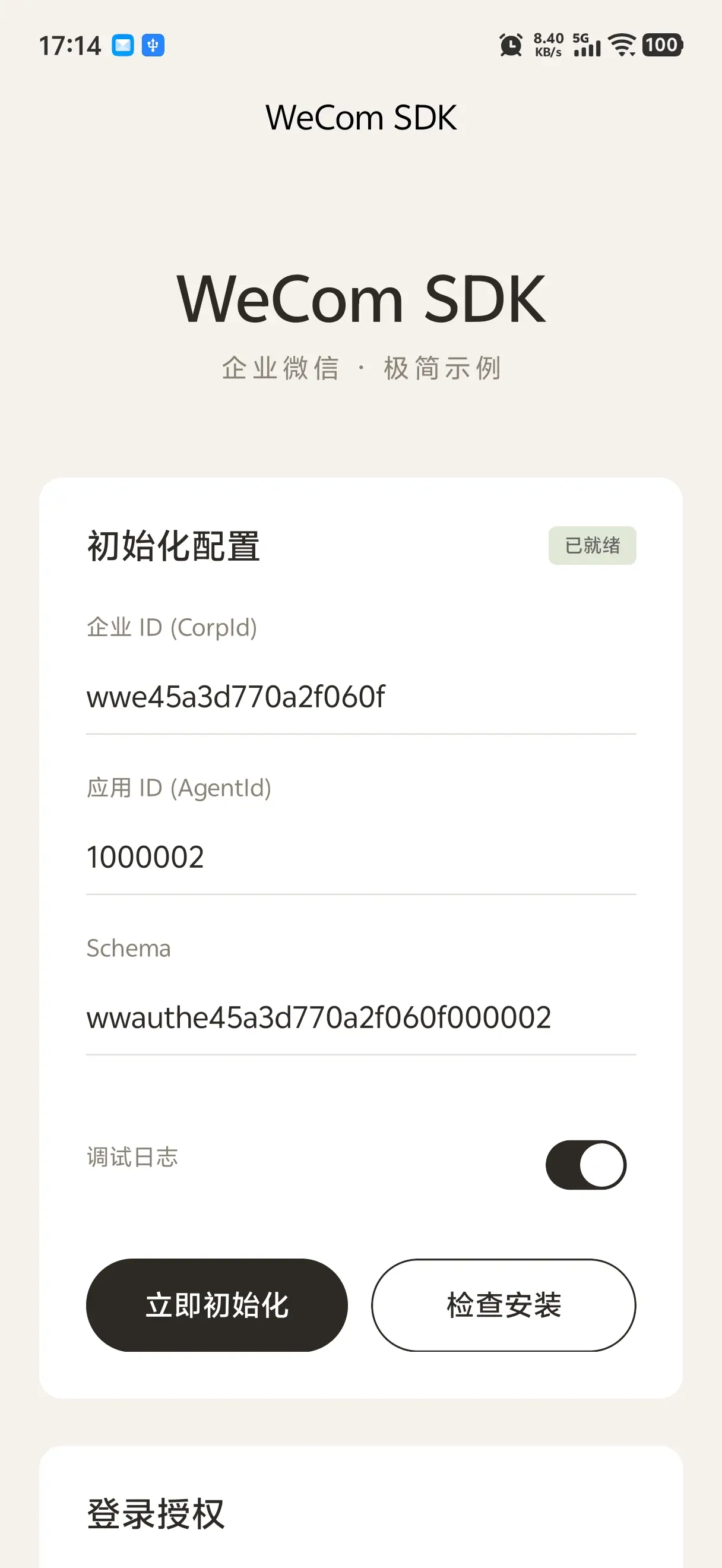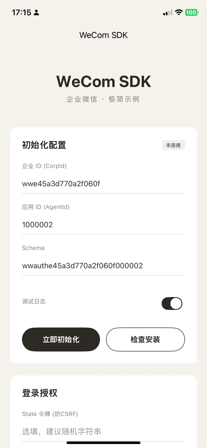 appId:企业 CorpID(形如wwxxxxxxxxxxxxxxxx)agentId:应用 AgentId(数字字符串)schema:管理后台生成(形如wwauth...)
