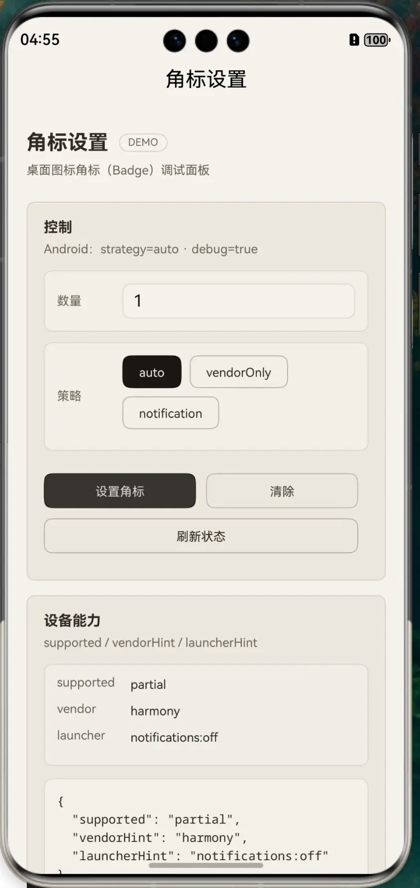 count: 角标数字(>= 0)android.strategy:auto(默认):按厂商/桌面路由并自动尝试备选路径vendorOnly:只走厂商路径,失败直接返回对应错误码(便于定位)notification:通过发送一条低等级通知驱动角标(更贴近 Android 生态,vivo 等机型更可能生效;可能在通知栏/通知中心看到一条通知,count=0 会取消通知)