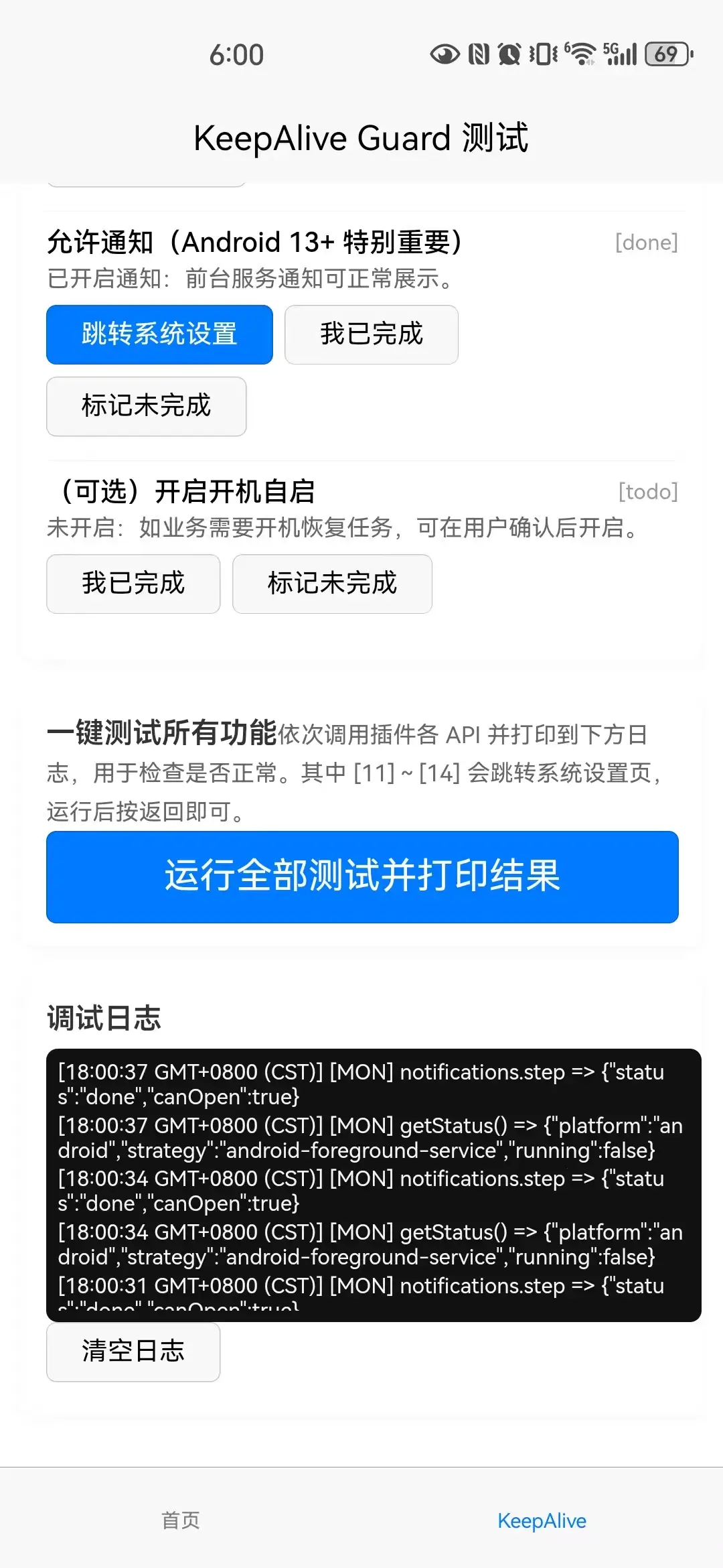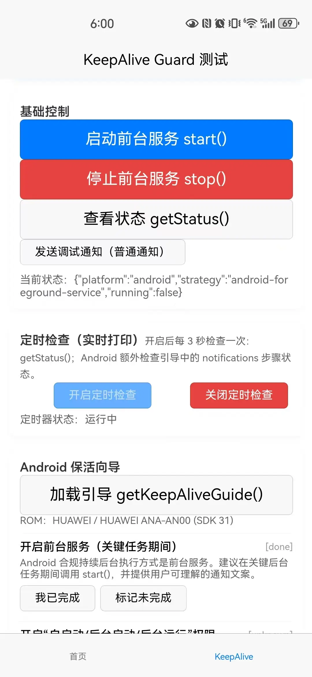 getStatus():查看当前保活策略与运行状态。getCapabilities():查看当前平台支持的保活能力。diagnoseAndroidKeepAlive():综合 ROM、白名单、自启动、通知等给出建议列表。