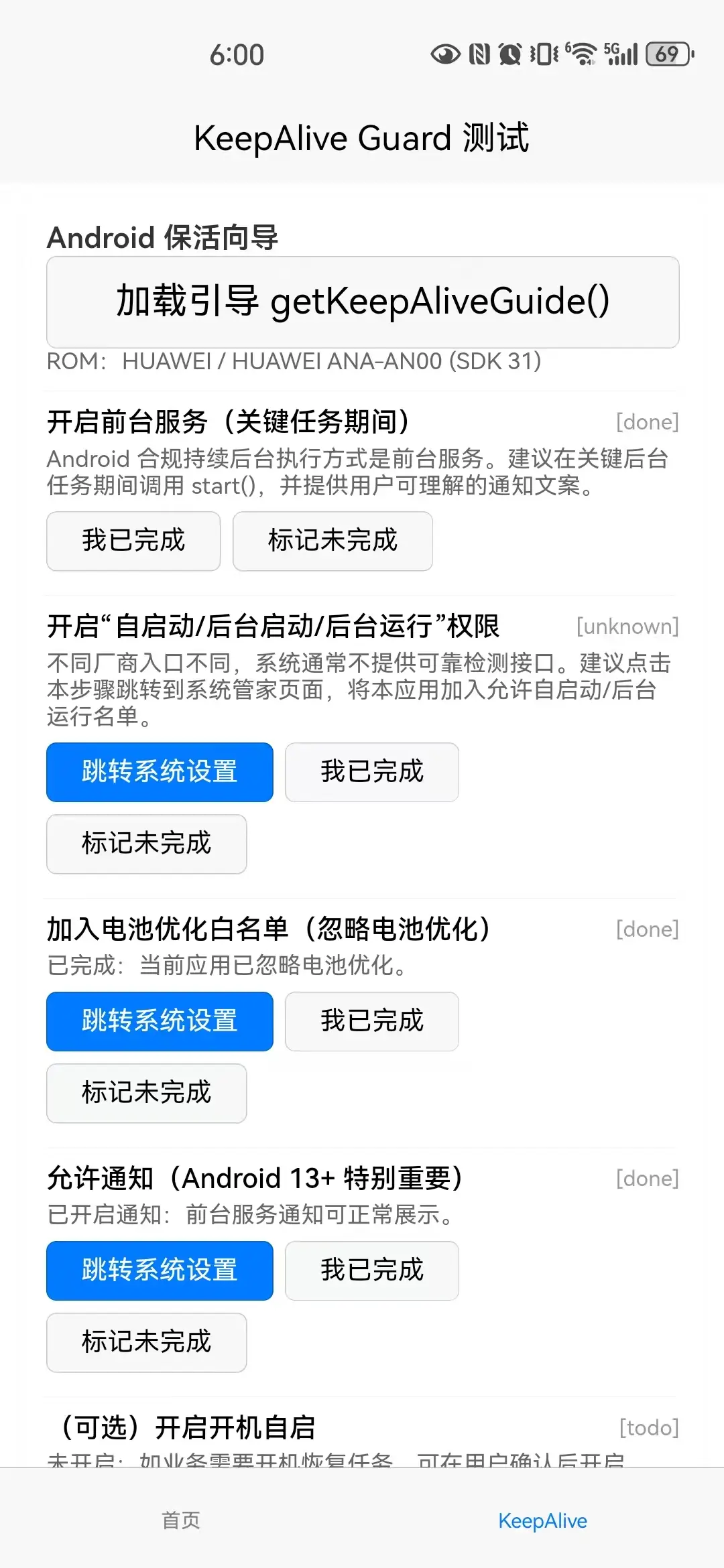 markKeepAliveGuideStepDone(stepId)/markKeepAliveGuideStepTodo(stepId)/resetKeepAliveGuideStep(stepId)/resetKeepAliveGuide()手动标记或重置引导步骤状态,用于无法可靠检测的场景(如自启动):