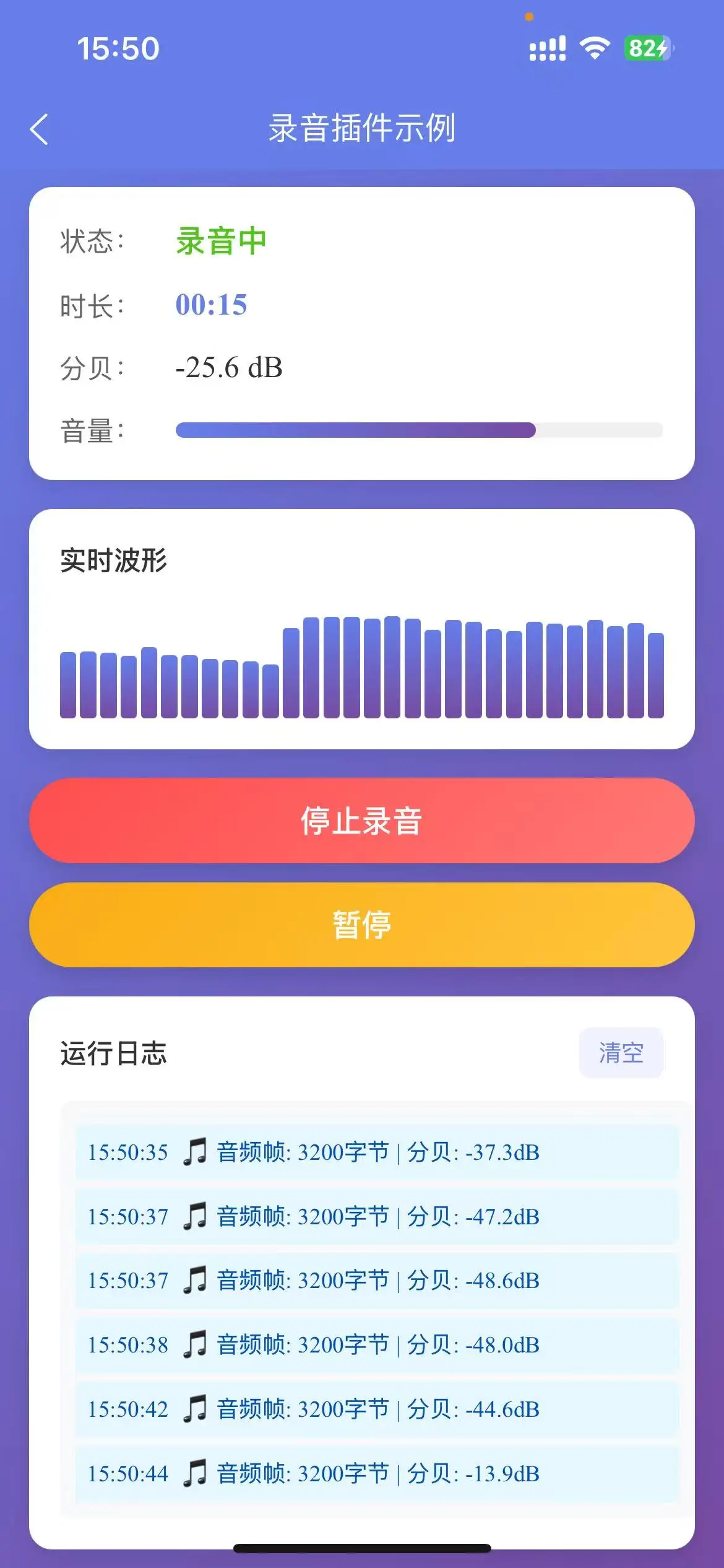 - ✅ 实时分贝监测 - RMS算法计算,实时返回音量分贝值