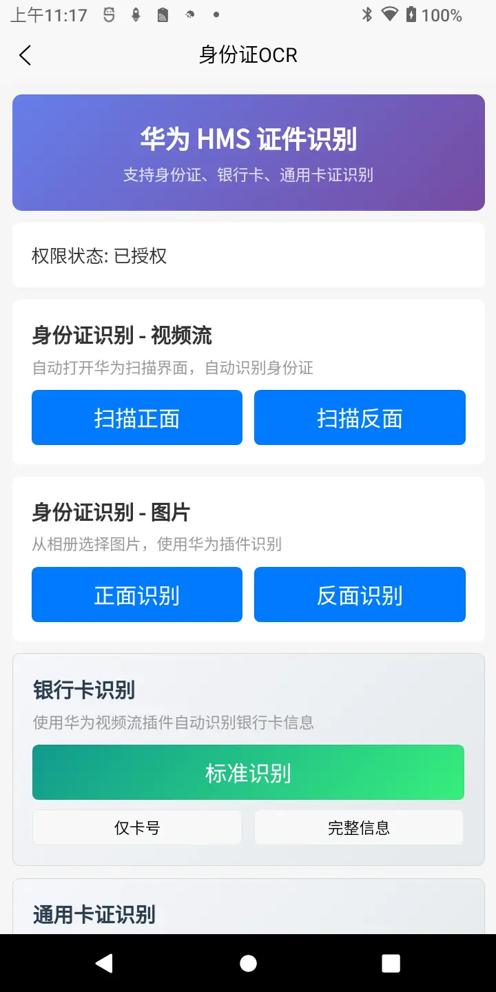 - ✅ 身份证识别 - 支持中国第二代身份证正反面识别(视频流/图片识别)