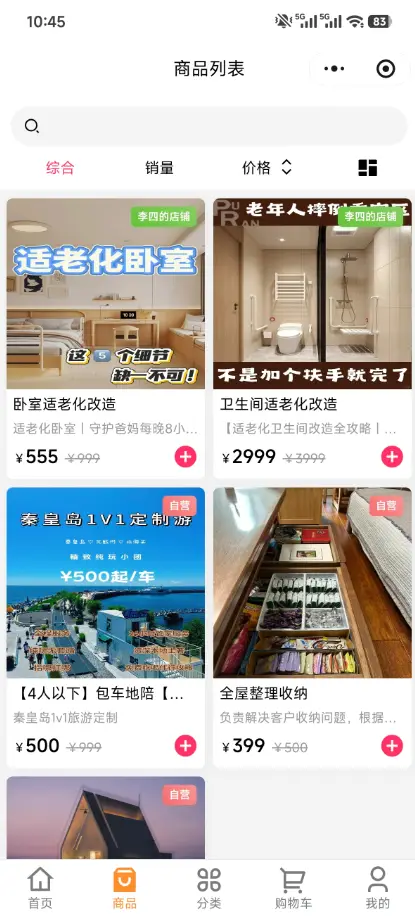 商品可分为自营和商铺入住等第三方的商品,可发布服服务商品以及定金商品