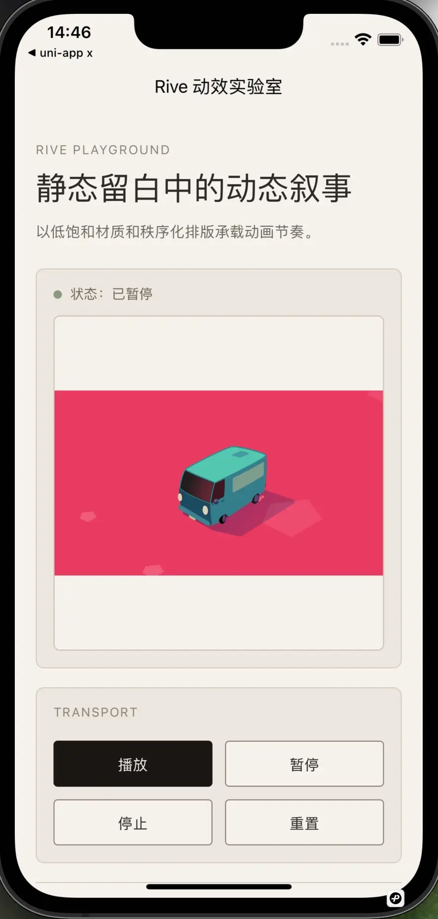 hans-rive 是一个 uni-app x 原生 Rive 组件,支持 App-Android、App-iOS。