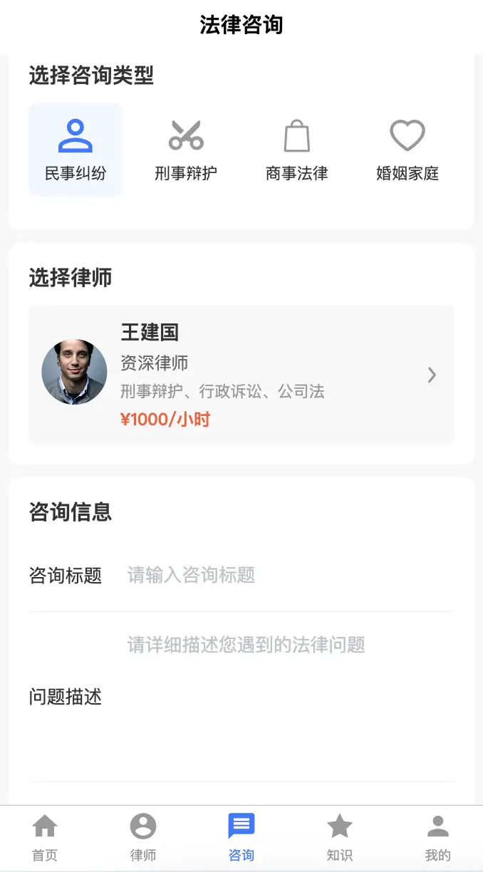 - 法律咨询 - 咨询类型选择、律师选择