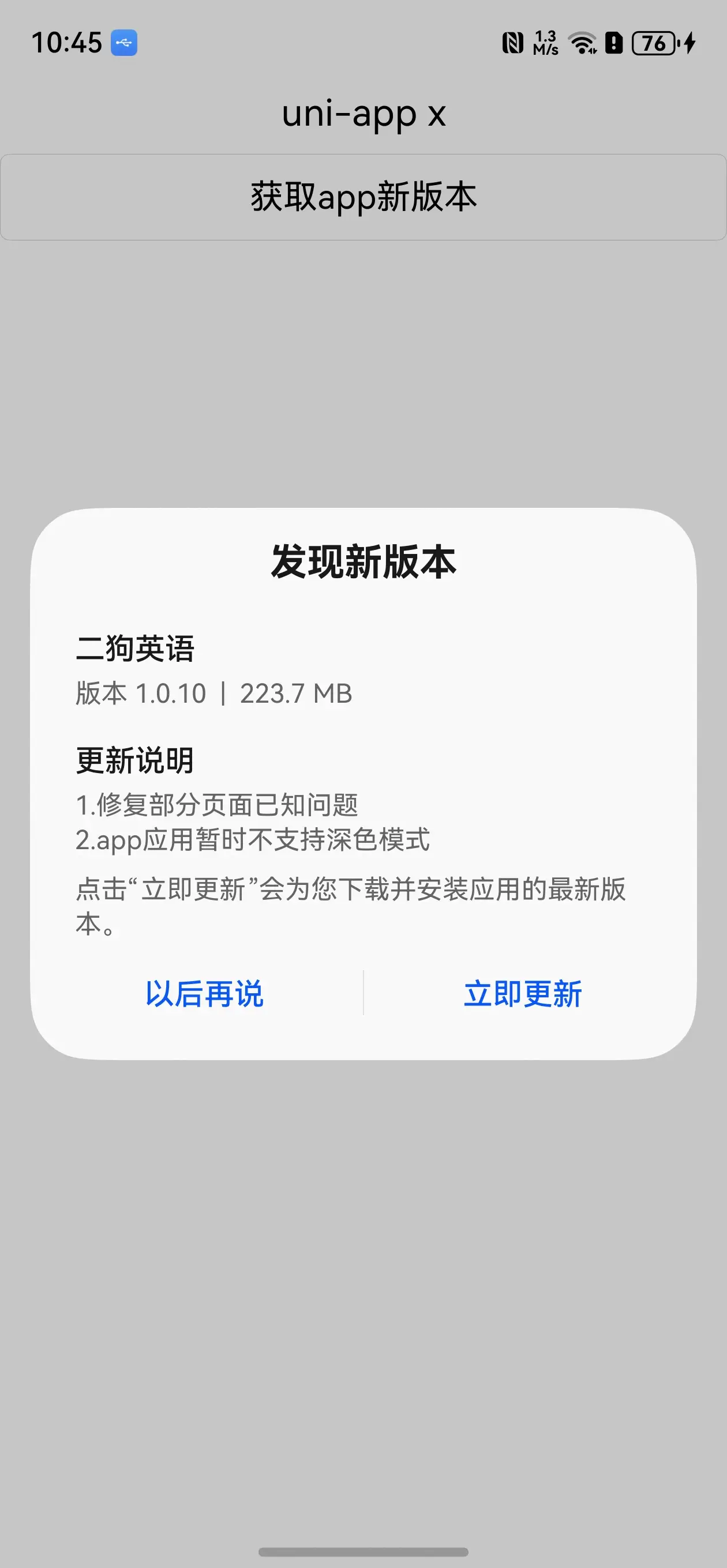 当前插件功能:uniapp端开发鸿蒙next app,获取app新版本更新提醒,点击跳转应用市场进行更新