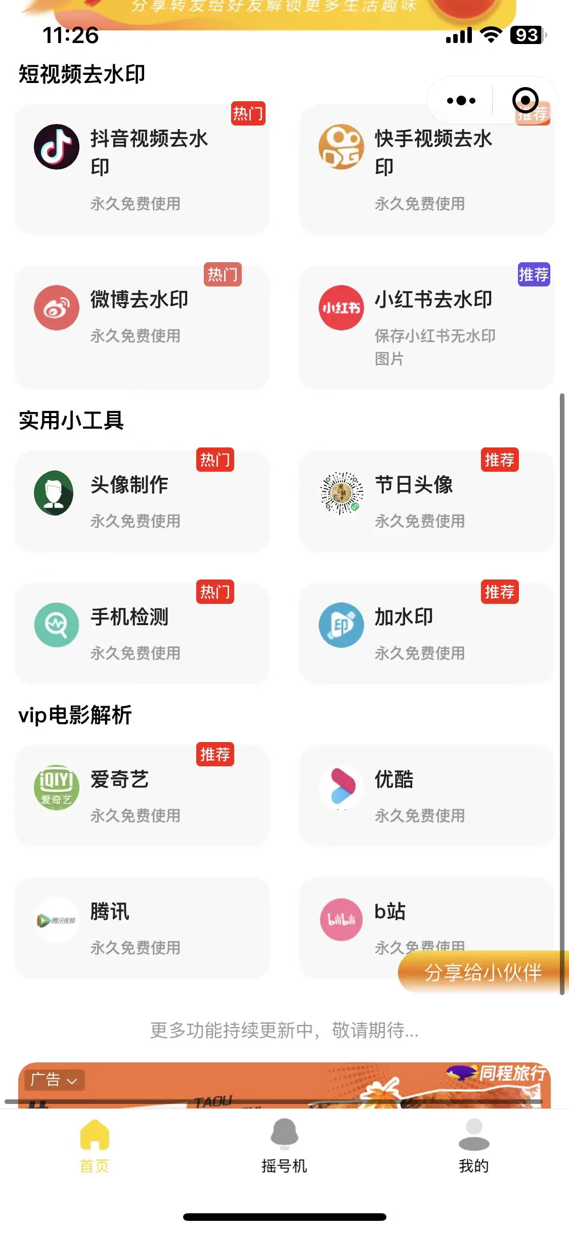 | 首页功能配置 | 首页 | ①去水印功能 ②头像挂饰 ③图片添加水印 ④vip电影解析 |