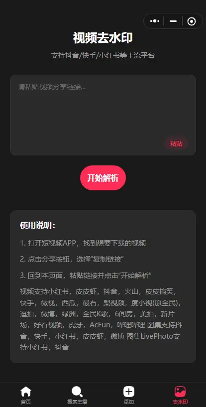 使用hbuilderx导入编译发行小程序即可,支持监控多个抖音直播间,轮询监控,开播后通过小程序订阅通知通知用户直播间开播状态,支持去水印,支持主流短视频平台无水印解析,支持图集解析