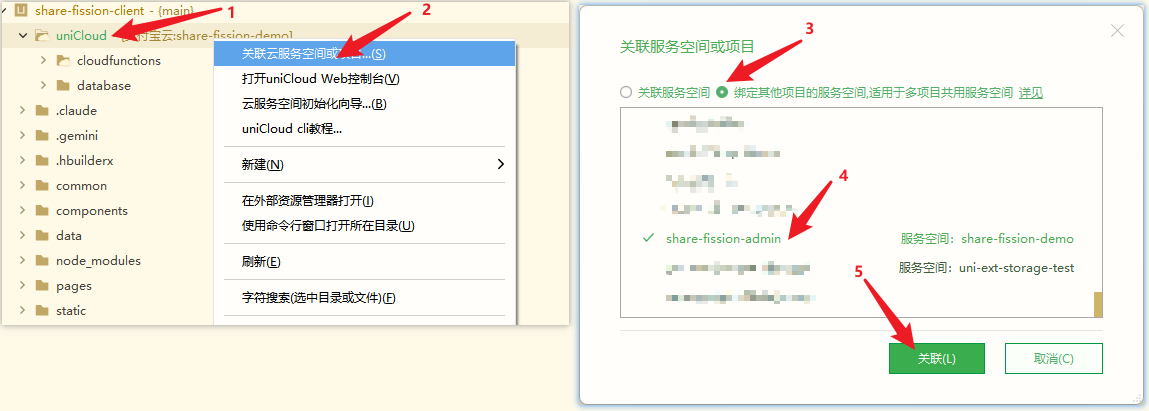uniCloud目录 → 选择"关联云服务空间或项目" - 创建或选择云服务空间(支付宝云/阿里云/腾讯云)