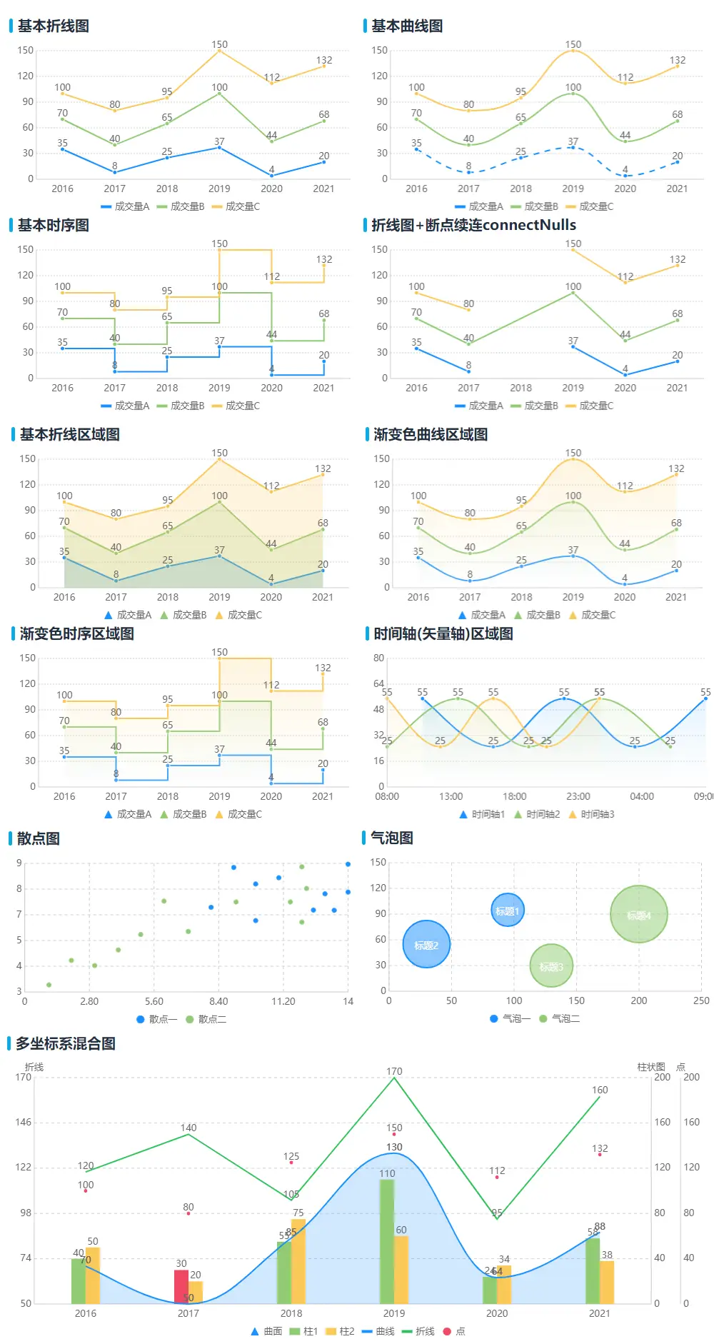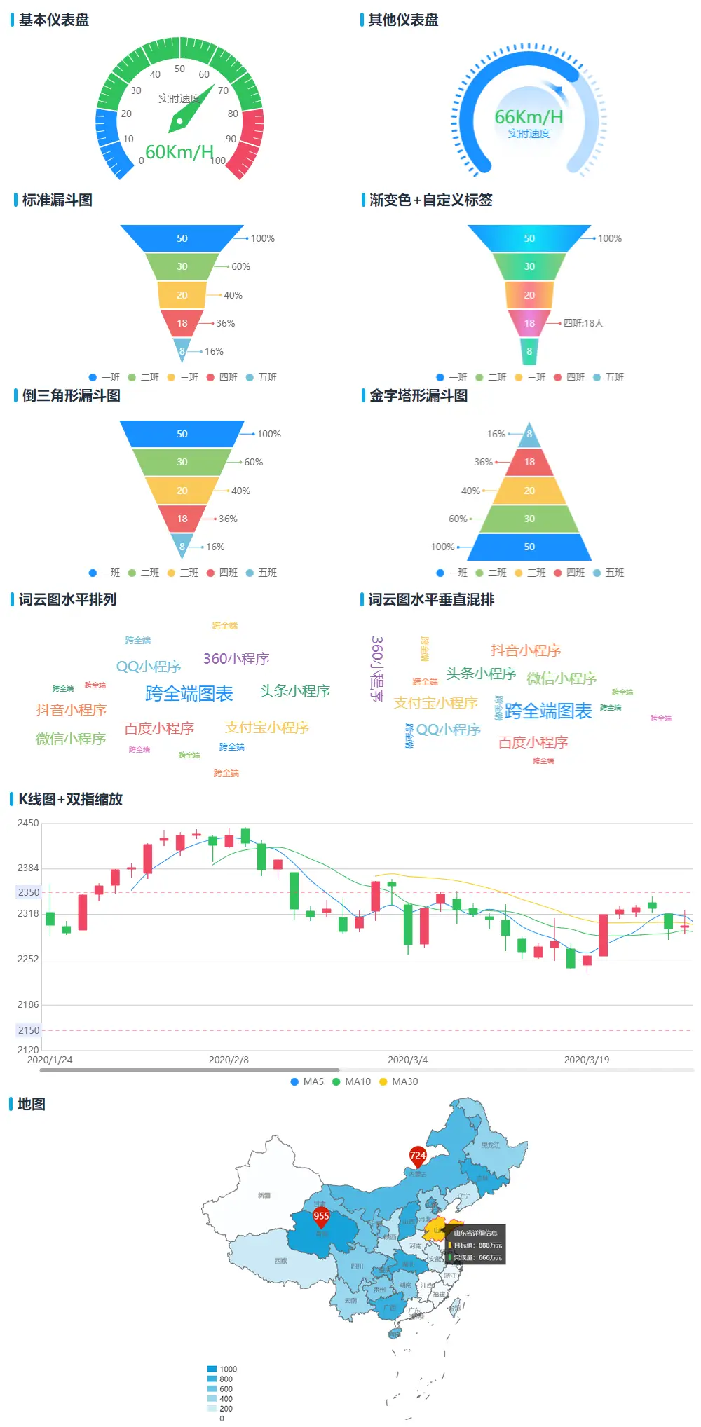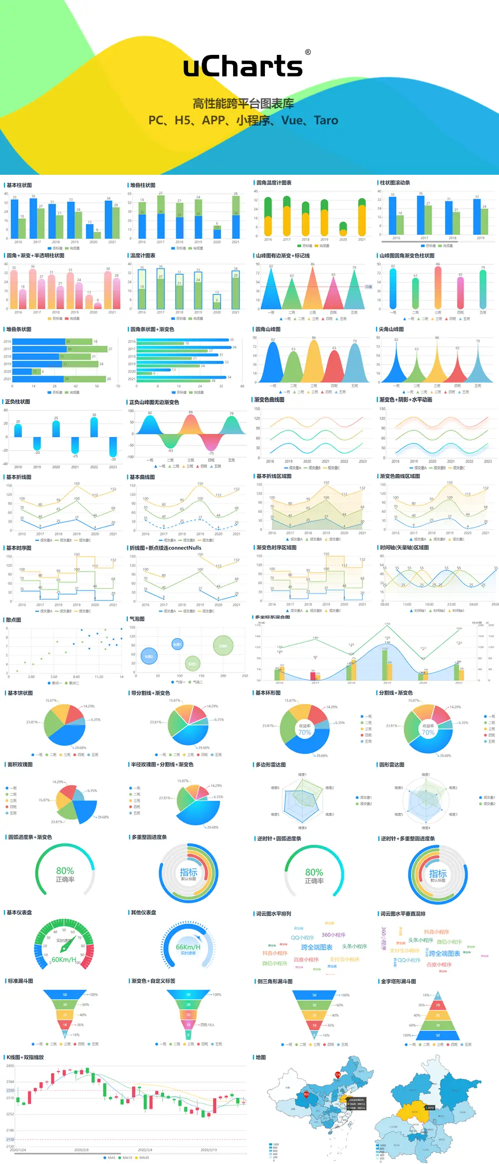 uCharts是一款基于canvas API开发的适用于所有前端应用的图表库,开发者编写一套代码,可运行到 Web、iOS、Android(基于 uni-app / taro )、以及各种小程序(微信/支付宝/百度/头条/飞书/QQ/快手/钉钉/淘宝)、快应用等更多支持 canvas API 的平台。