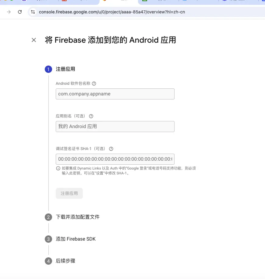 - 点击创建的项目,添加Android,添加的时候Android需要绑定包名和打包证书签名的SHA-1(可选),下载Android的google-services.json,注意自定义基座或云打包时需要用绑定的包名和打包证书