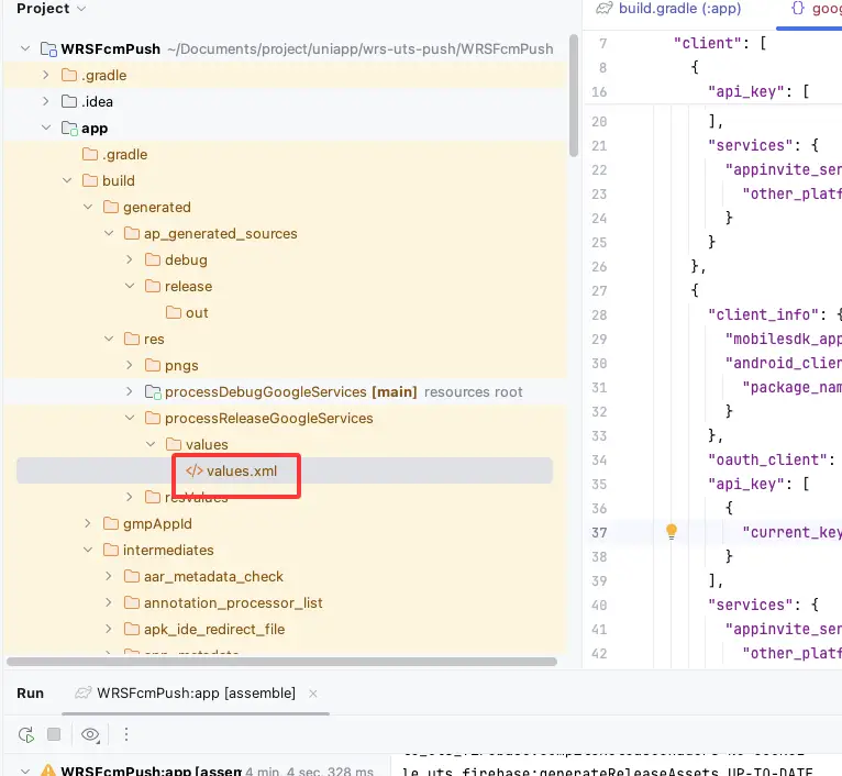 - 将google-services.json里的内容填入替换nativeResources/android/res/values/config.xml文件的内容: