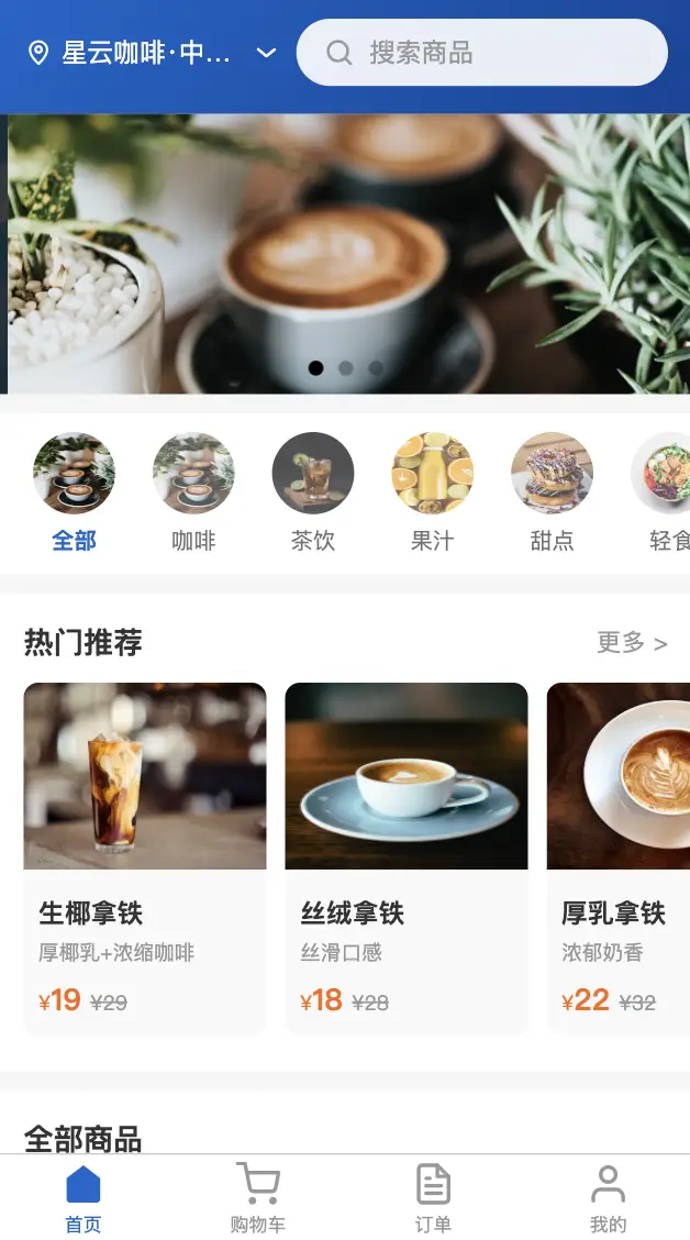 星云咖啡是一个基于uni-app和uniCloud开发的咖啡点单小程序,参考瑞幸咖啡风格设计。支持微信小程序、H5、APP多平台部署,提供完整的咖啡点单流程,包括商品浏览、购物车管理、订单管理、优惠券、门店导航等功能。