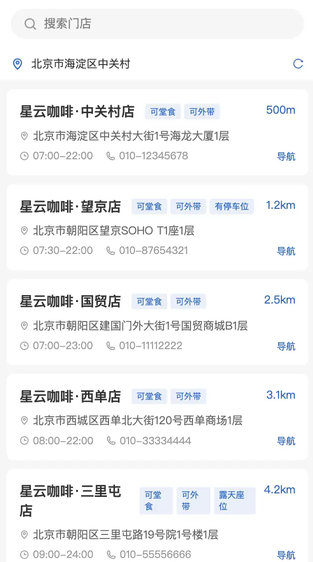 - 门店导航:附近门店查询、地图导航