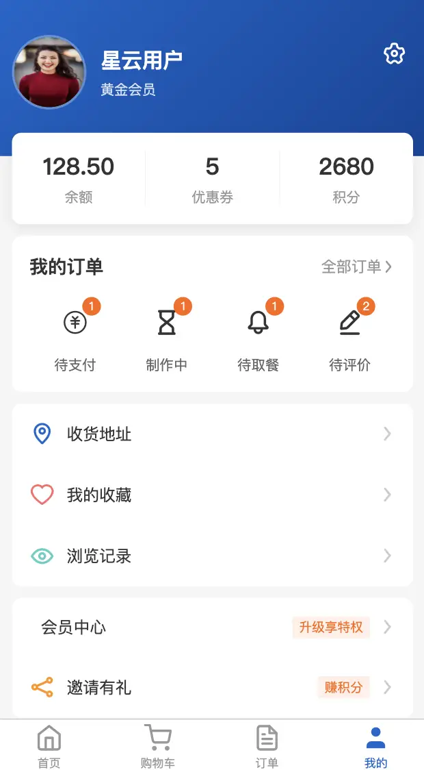 用户信息、订单入口、功能菜单 |