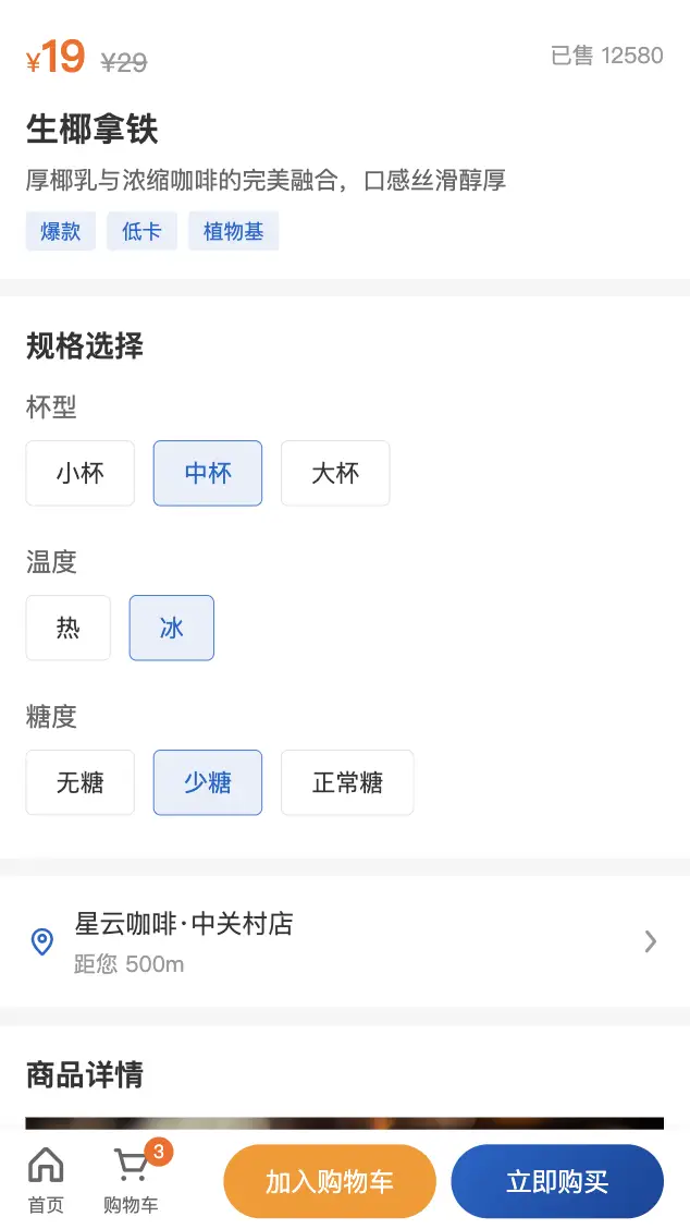 商品图片、规格选择、购买功能 |