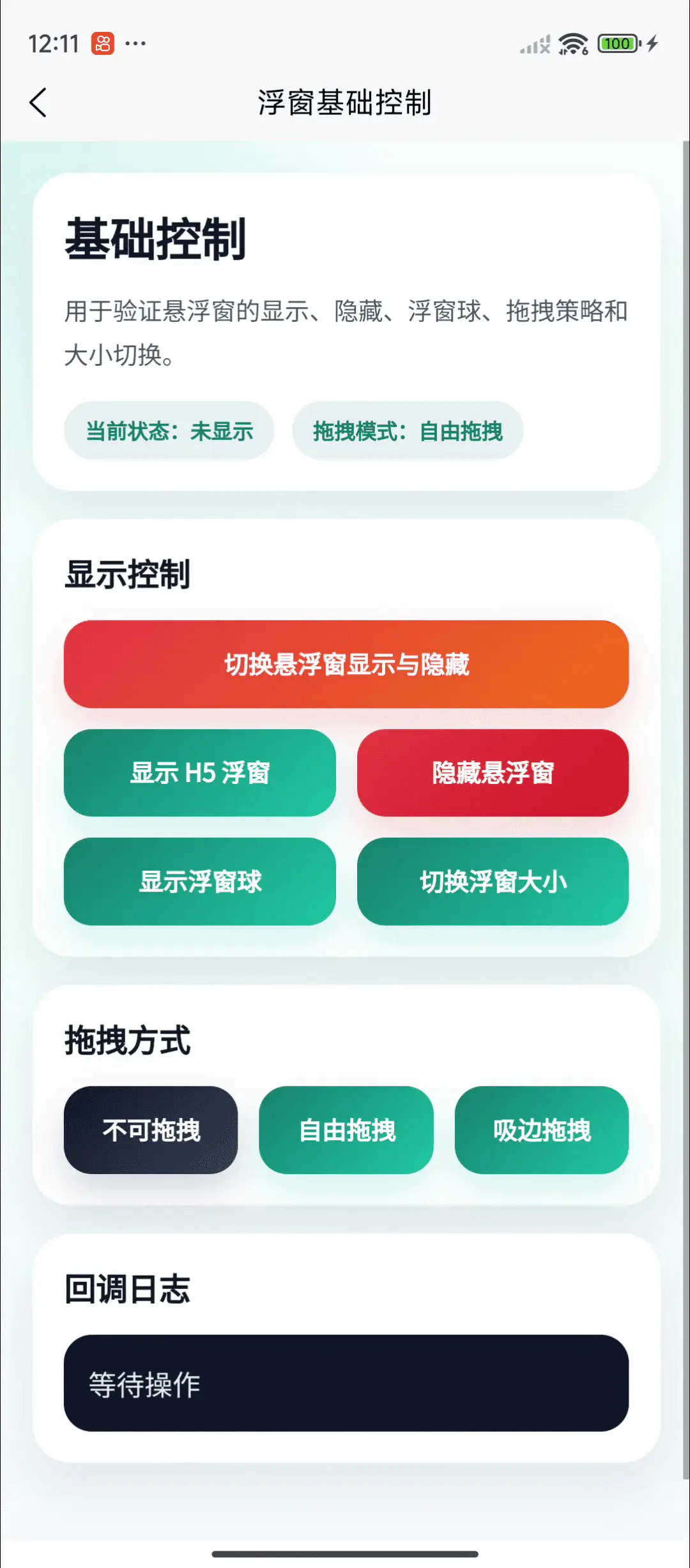面向 Android 场景的高阶悬浮窗增强插件,支持 WebView 自定义内容承载、自由拖拽与吸边停靠、尺寸切换、系统级悬浮、画中画联动及一像素保活能力,适用于工具面板、识别辅助、消息提示与轻量工作台等复杂交互场景。