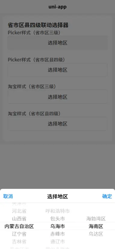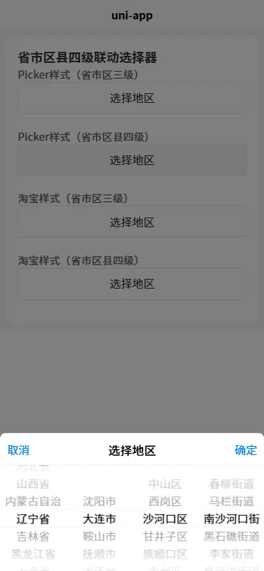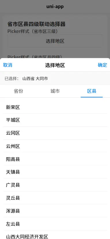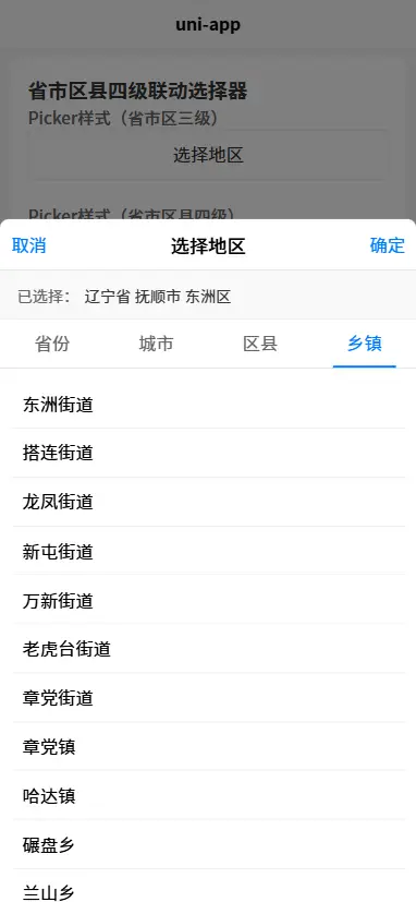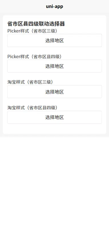 一个基于uni-app开发的省市区县四级联动选择器组件,支持多种样式和多端兼容。