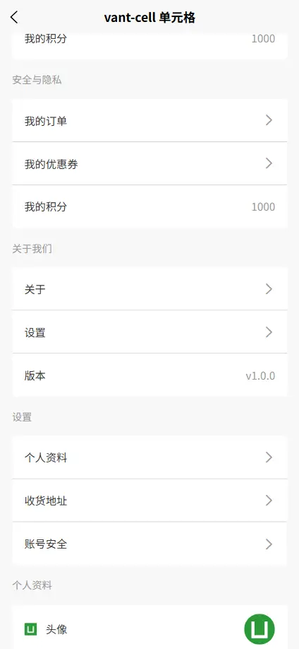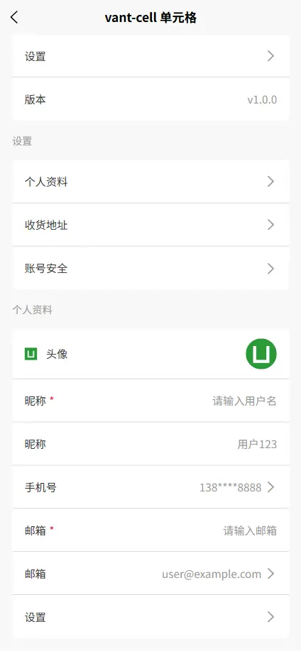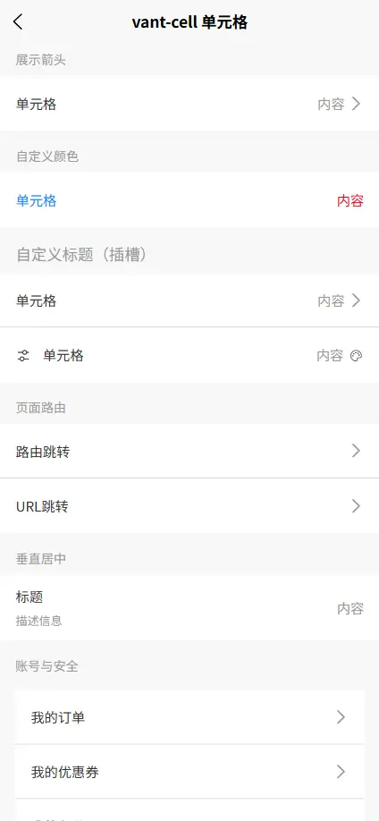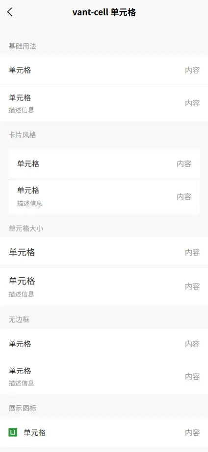 <vant-cell title="标题" icon="图标路径" value="内容" />