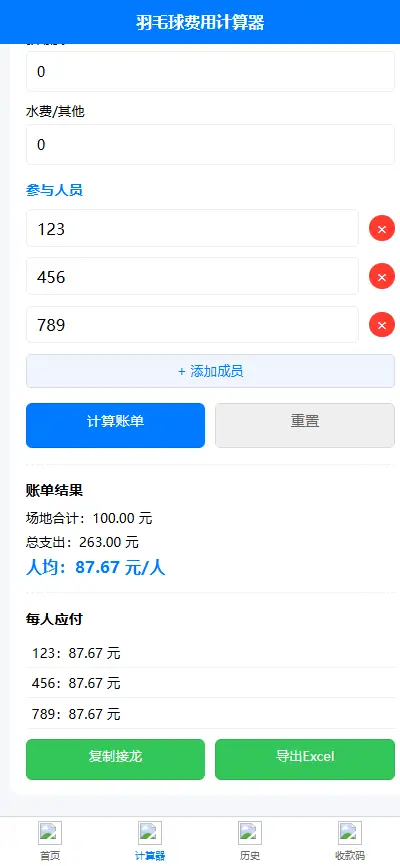 - 核心功能 计算场地总费用(时长 × 场地单价) 加入羽毛球消耗费用分摊 输入参与人数,自动计算人均总费用 极简输入,实时显示结果