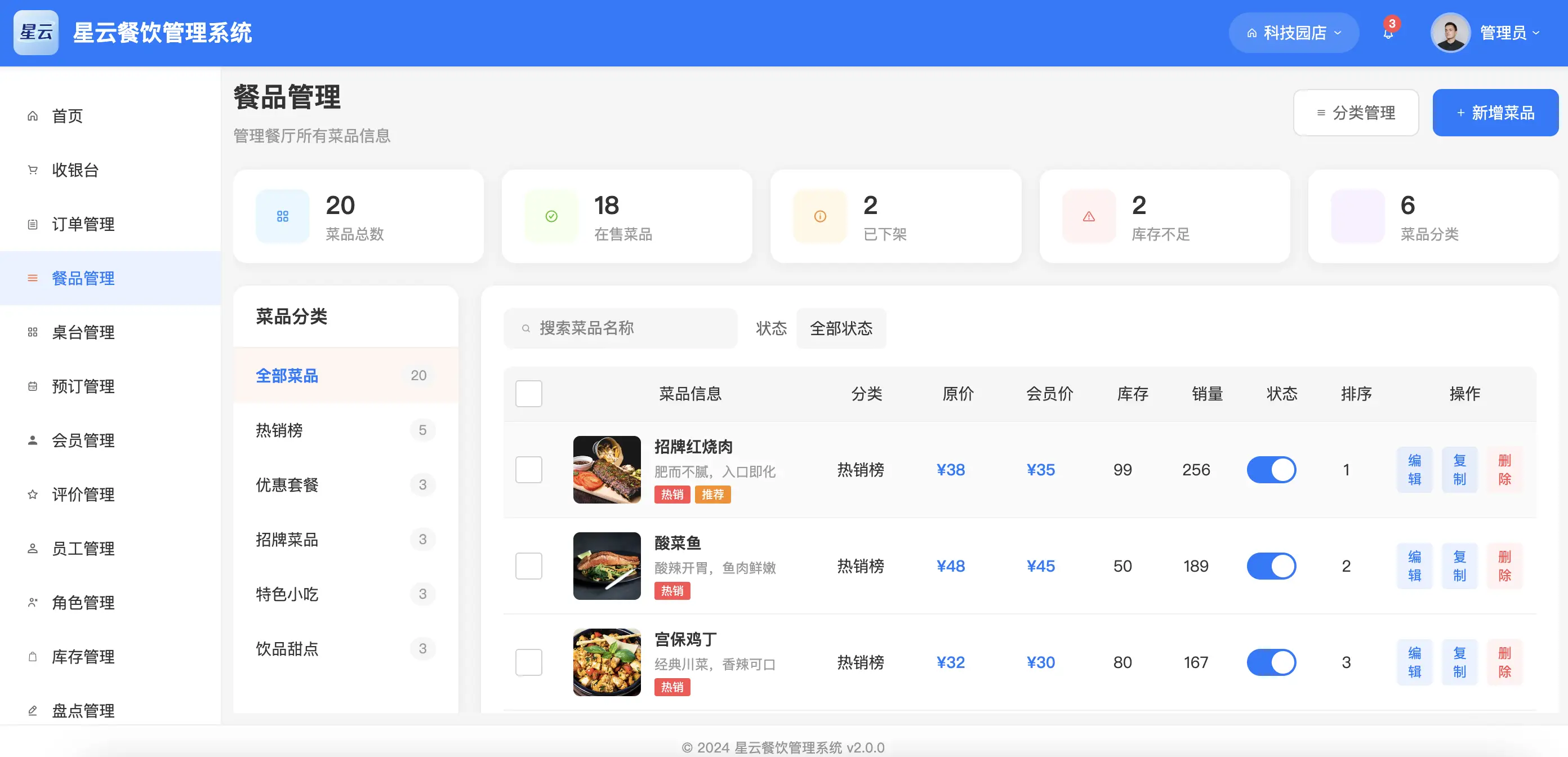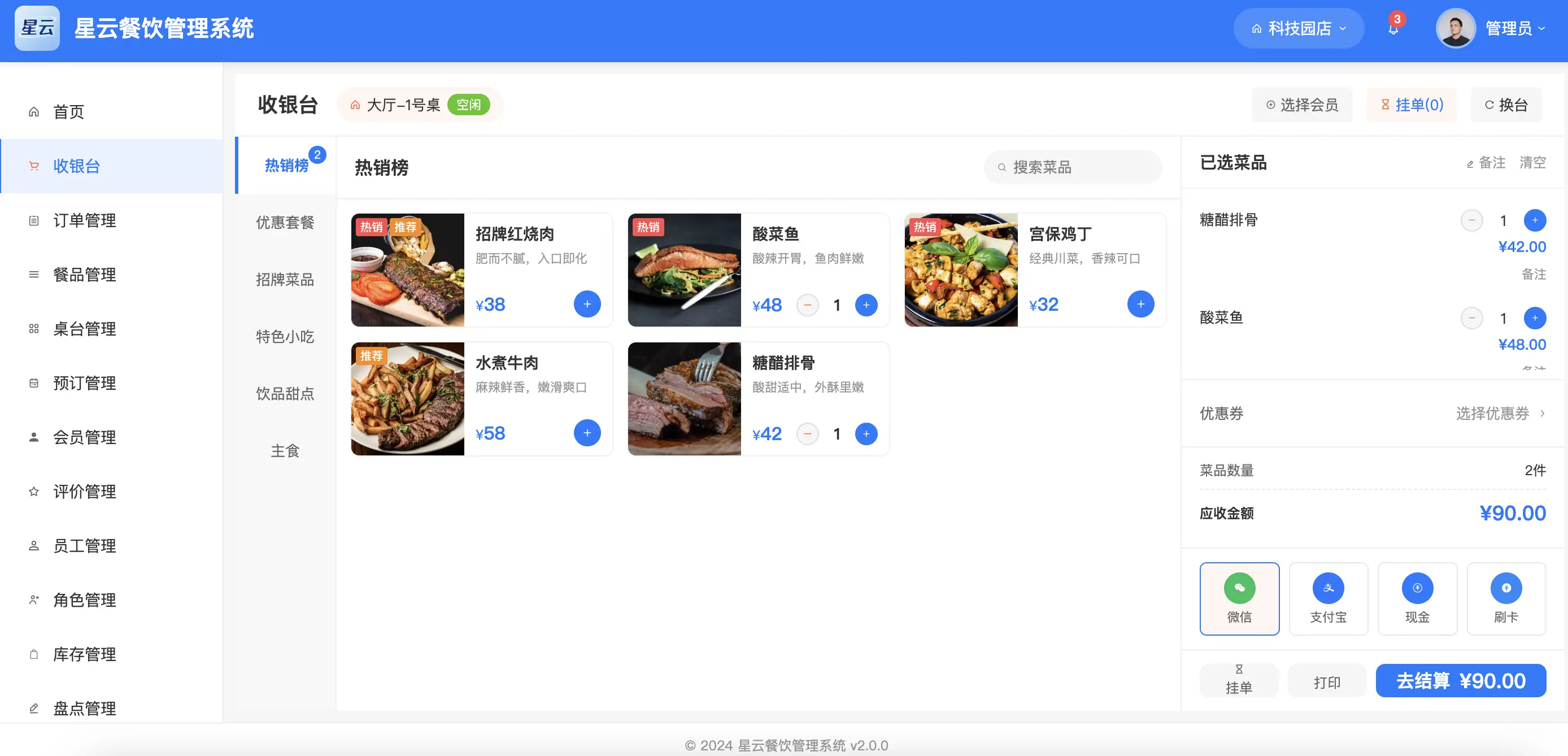 - 桌面端:实现工作台、收银台、订单管理、菜品管理、会员管理等核心功能
