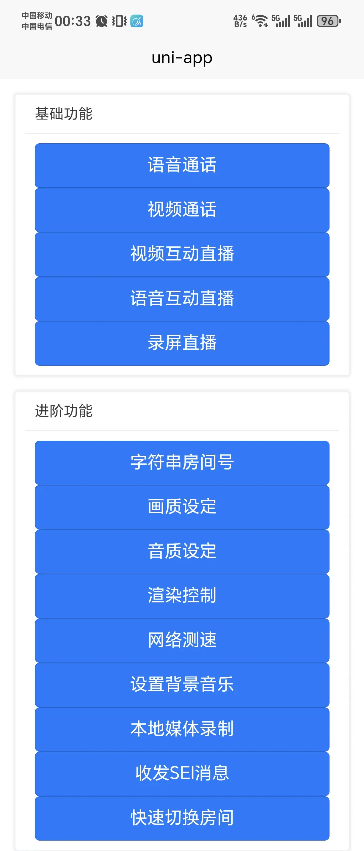 安卓腾讯实时音视频UTS原生插件集成了语音通话,视频通话,视频互动直播,语音互动直播,录屏直播等功能,使用简单,方便您快速对接腾讯实时音视频,插件支持uniapp和uniapp x,支持vue2和vue3的选项式和组合式