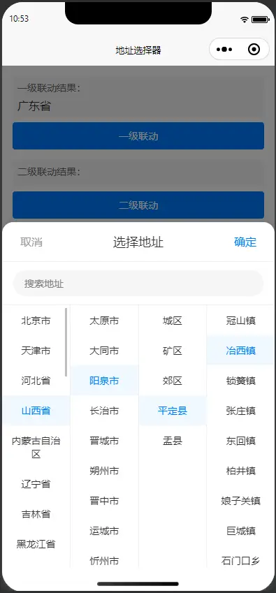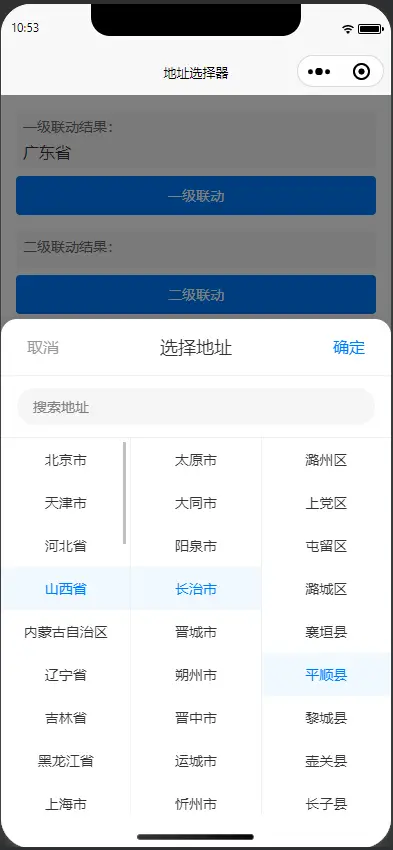 - 智能搜索功能:根据当前联动级别进行搜索,一级联动只搜索一级数据,二级联动搜索一级和二级数据,以此类推