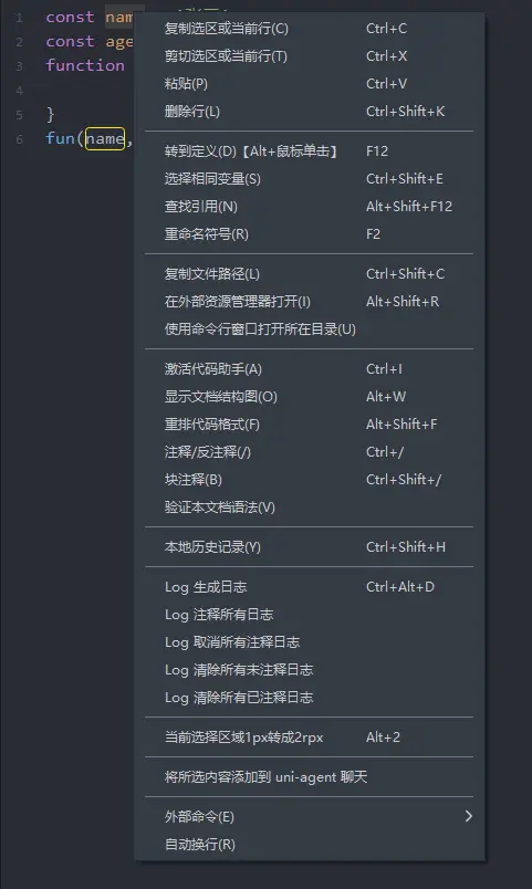 | Log 生成打印 | 选中变量后,自动在下一行生成带有变量名标识的 console.log,未选变量克隆当前行。 |