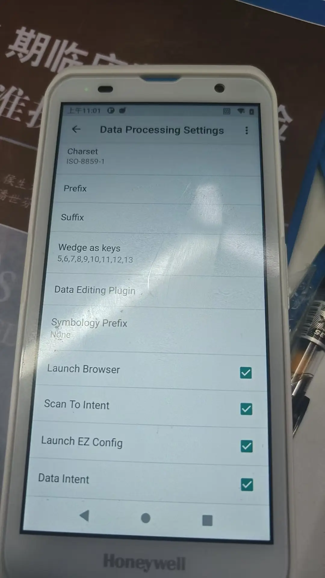 请在 PDA 扫描设置 中将输出方式设为 Intent / 广播,并开启 附带解码数据(常见文案:Data、字符串、附加字段等)。若广播不带任何条码数据,日志中会出现 [PDA Scan] 广播 Intent 未附带条码 类提示,此时应用无法解析,需先改设备端输出配置。