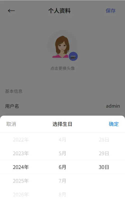 <date-picker v-model="birthday" mode="date" />