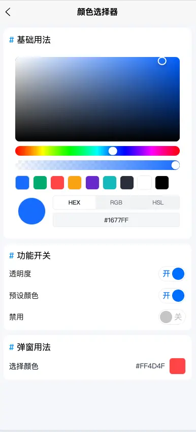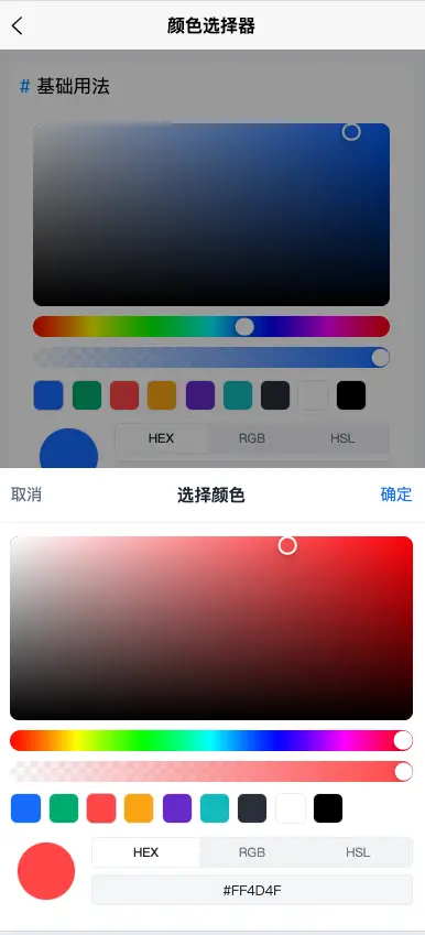 一个适用于 uni-app 的颜色选择器组件,支持 HEX、RGB、HSL 输入切换,支持透明度、预设色以及底部弹窗选择。