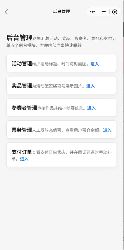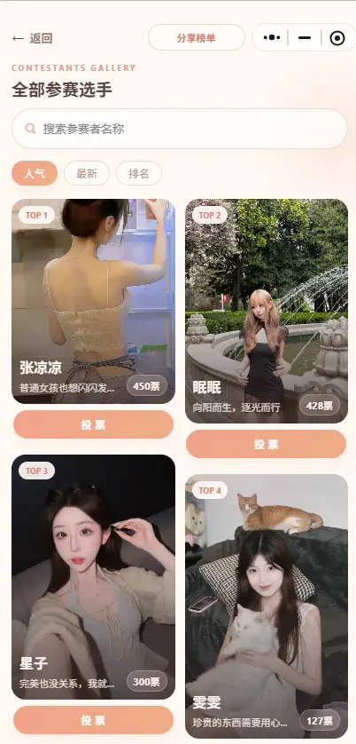 - 支持活动报名、作品展示、榜单评选、在线投票