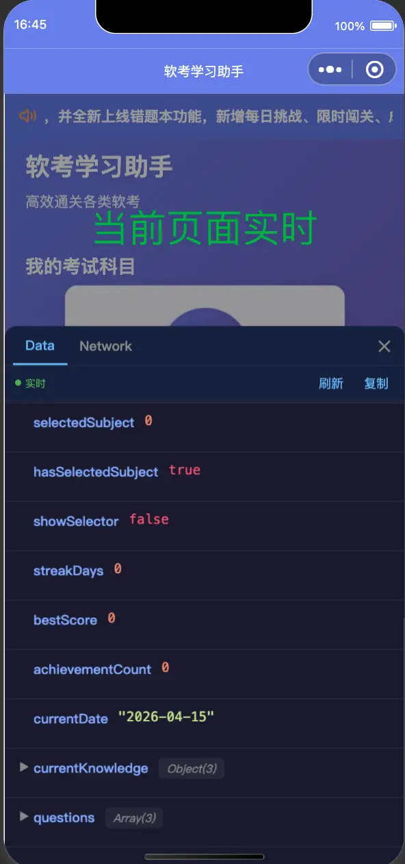 在页面上直接显示一个可视化浮层面板,清晰展示当前页面的 data 数据。