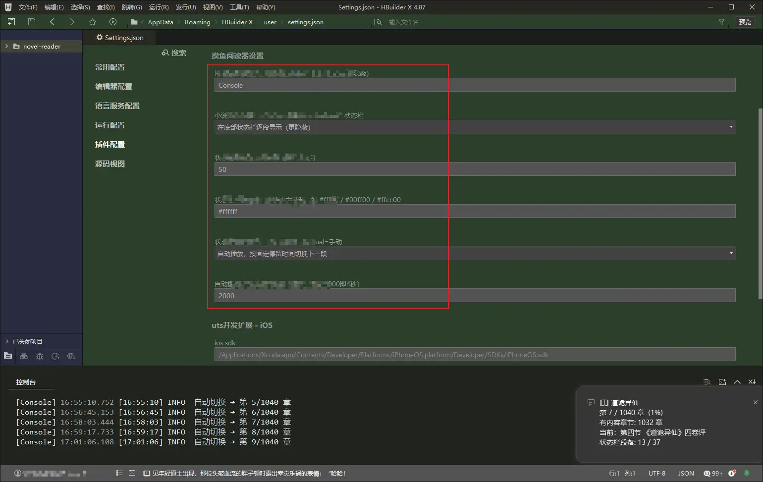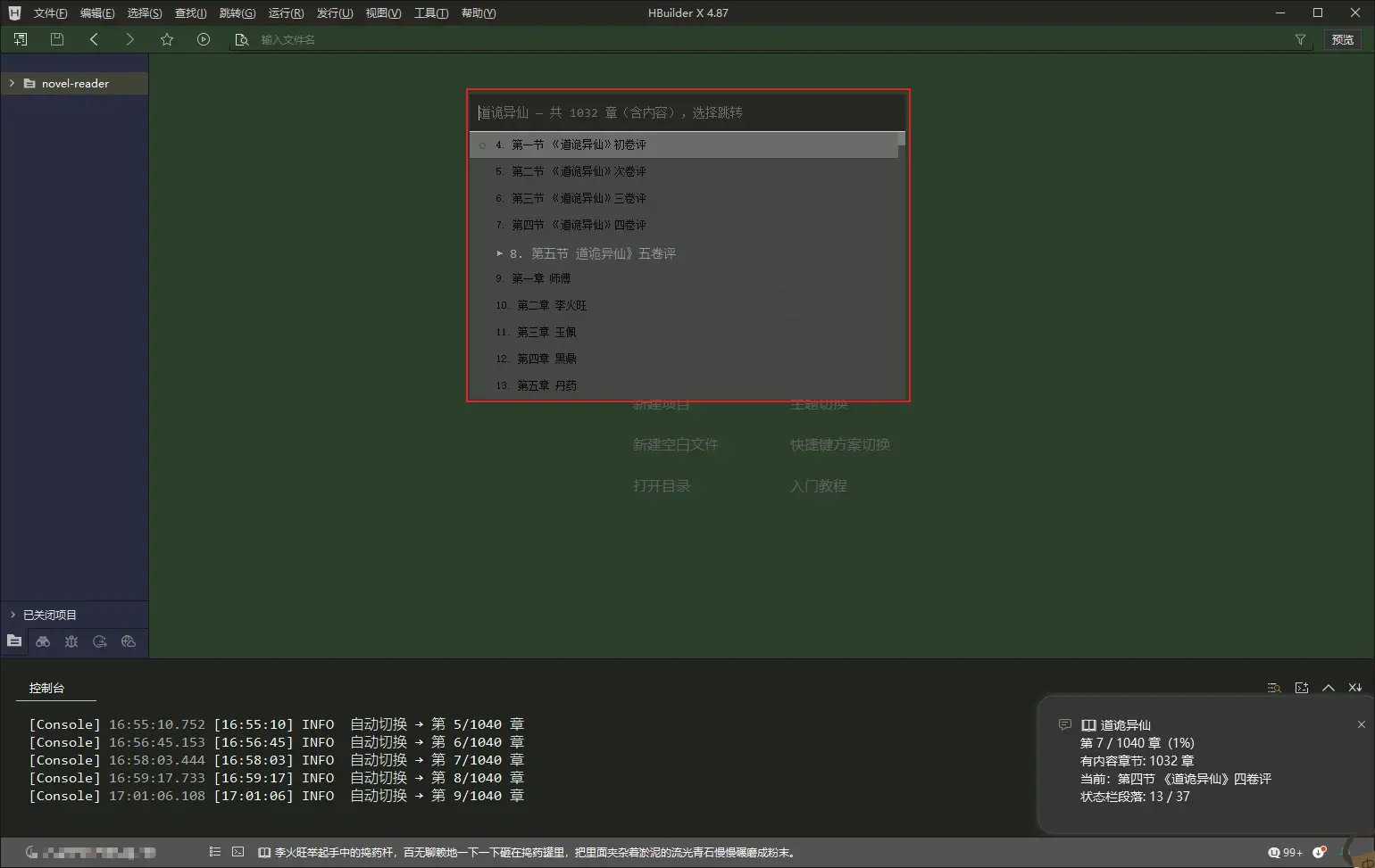 在 HBuilderX 控制台或状态栏中阅读本地小说,输出格式伪装成日志,摸鱼必备!