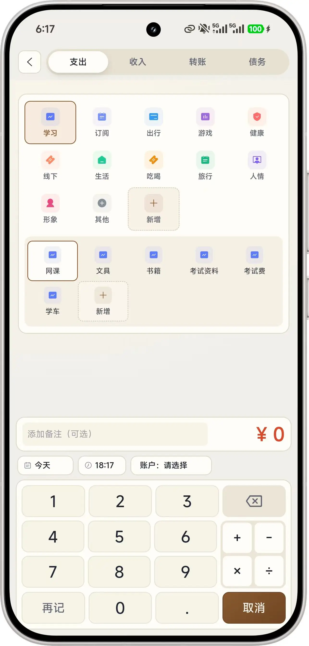 - 支持选择账户、分类、日期、时间、备注