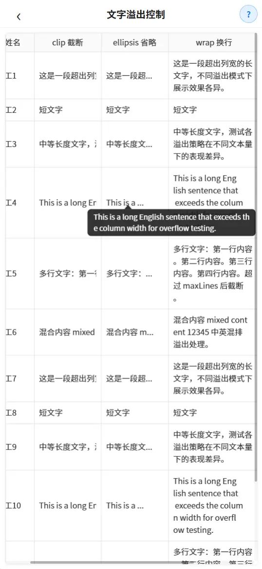 - 支持文本溢出处理:截断 / 省略号 / 自动折行(