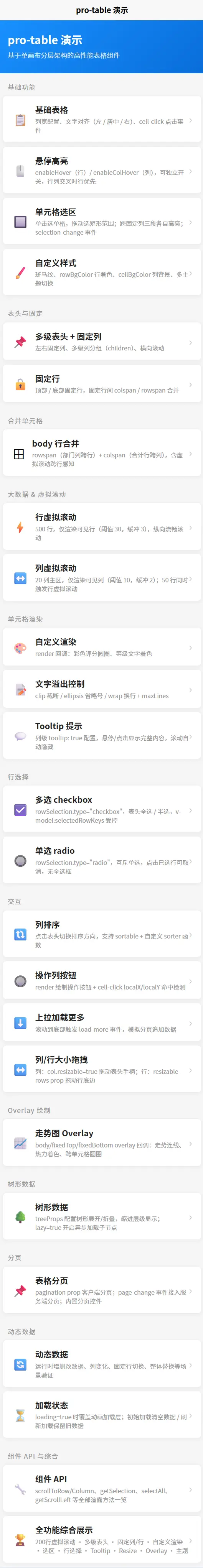 pro-table 是一个基于单 canvas 分层渲染的高性能表格组件,面向 uni-app + Vue 3 场景,兼容 H5 和小程序端。