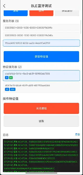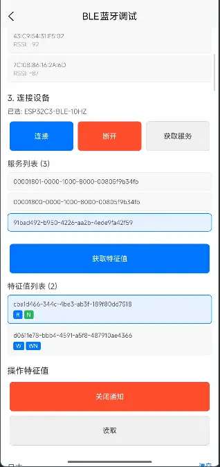 连接成功后,依次调用 getBLEDeviceServices 和 getBLEDeviceCharacteristics,把目标服务和特征值加载出来。