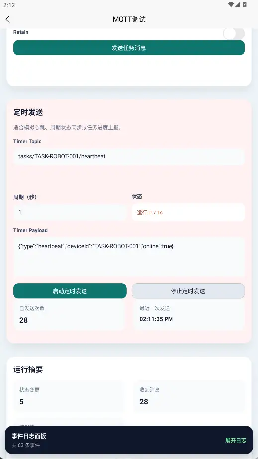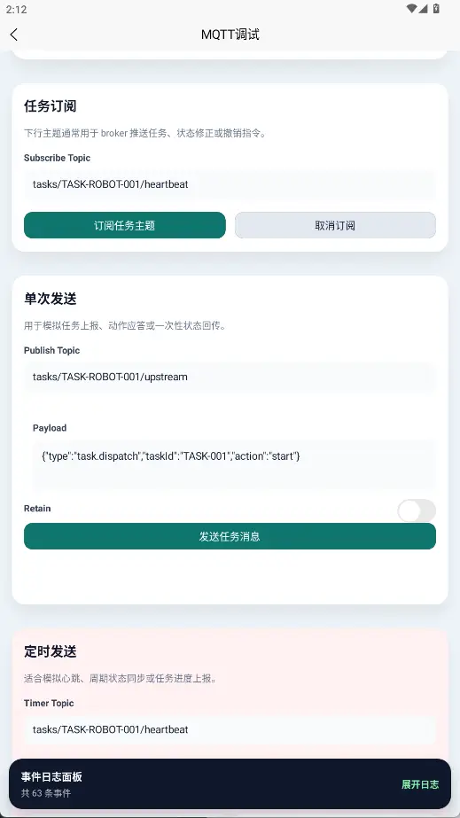 该页面提供了 Broker 连接、任务主题订阅、单次发送、定时发送和日志抽屉展示的完整调试入口。