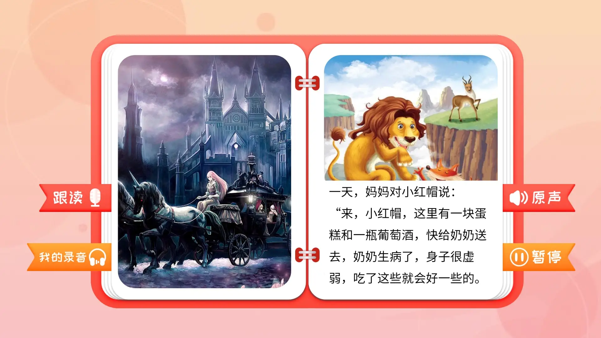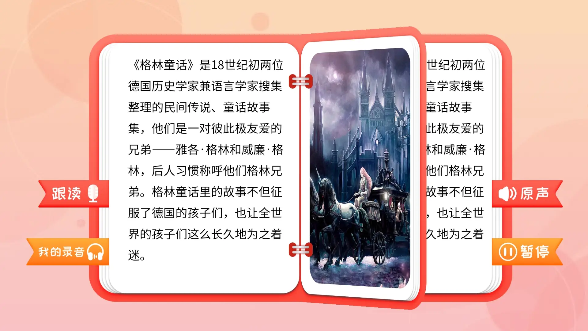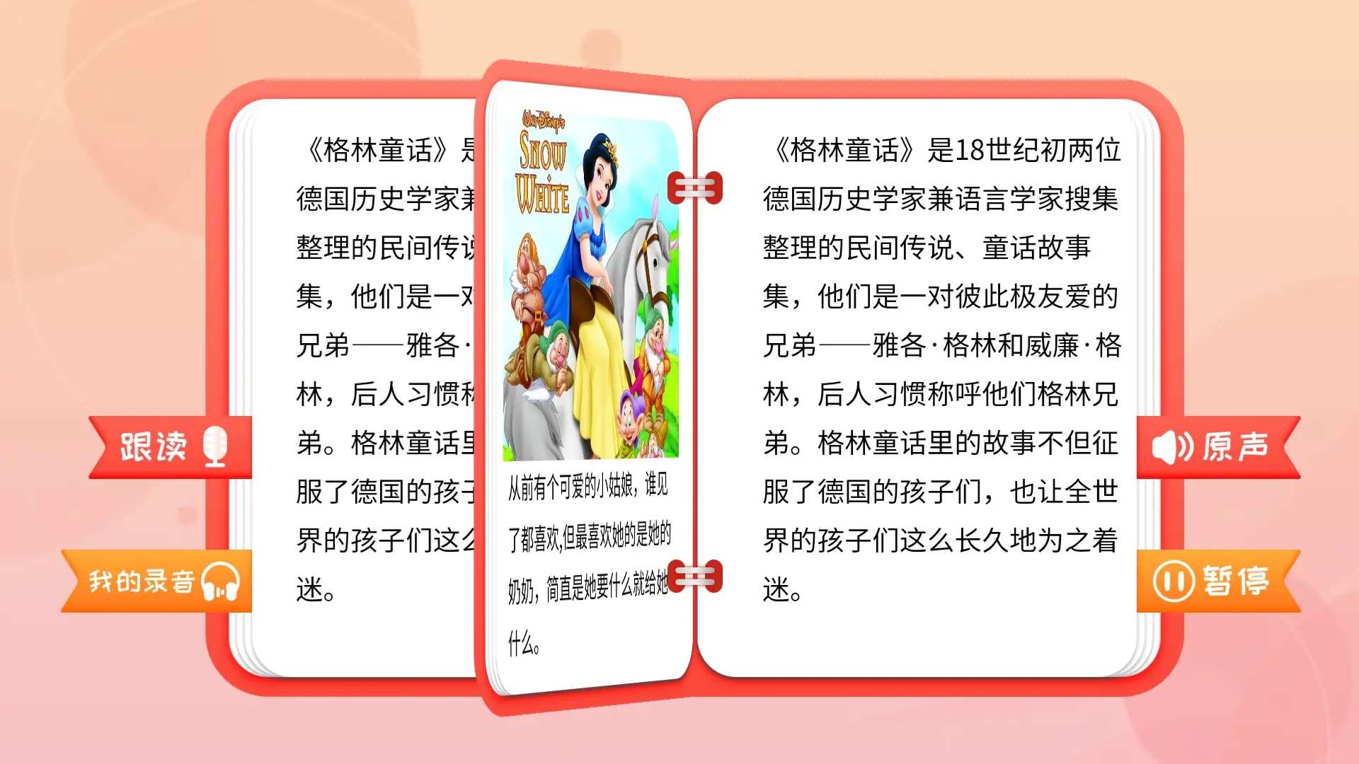 book:{ "id":"234324", "bookName":"格林童话", "bookType":1, "coverFrontImg":"/static/course/demo-book-1.jpg", "coverBackImg":"/static/course/page-img.png", "pages":[ { "showType":2, "imgUrl":"", "content":" 《格林童话》是18世纪初两位德国历史学家兼语言学家搜集整理的民间传说、童话故事集,他们是一对彼此极友爱的兄弟——雅各·格林和威廉·格林,后人习惯称呼他们格林兄弟。格林童话里的故事不但征服了德国的孩子们,也让全世界的孩子们这么长久地为之着迷。", "mp3":"http://music.163.com/song/media/outer/url?id=27901793.mp3", "pageNum":1 }, { "showType":1, "imgUrl":"/static/course/demo-book.jpg", "content":"", "mp3":"", "pageNum":2 }, { "showType":3, "imgUrl":"/static/course/demo-book-1.jpg", "content":"从前有个可爱的小姑娘,谁见了都喜欢,但最喜欢她的是她的奶奶,简直是她要什么就给她什么。", "mp3":"http://m10.music.126.net/20200917160904/eff29f486ee523a10449c6c6298f902c/ymusic/6c3e/4e3d/0792/a7d45cbc35069e0fe9b100b85edb0f31.mp3", "pageNum":3 }, { "showType":2, "imgUrl":"", "content":" 《格林童话》是18世纪初两位德国历史学家兼语言学家搜集整理的民间传说、童话故事集,他们是一对彼此极友爱的兄弟——雅各·格林和威廉·格林,后人习惯称呼他们格林兄弟。格林童话里的故事不但征服了德国的孩子们,也让全世界的孩子们这么长久地为之着迷。", "mp3":"http://music.163.com/song/media/outer/url?id=27907941.mp3", "pageNum":4 }, { "showType":1, "imgUrl":"/static/course/demo-book.jpg", "content":"", "mp3":"", "pageNum":5 }, { "showType":3, "imgUrl":"/static/course/demo-book-2.jpg", "content":"一天,妈妈对小红帽说:“来,小红帽,这里有一块蛋糕和一瓶葡萄酒,快给奶奶送去,奶奶生病了,身子很虚弱,吃了这些就会好一些的。", "mp3":"http://music.163.com/song/media/outer/url?id=28875230.mp3", "pageNum":6 } ] }