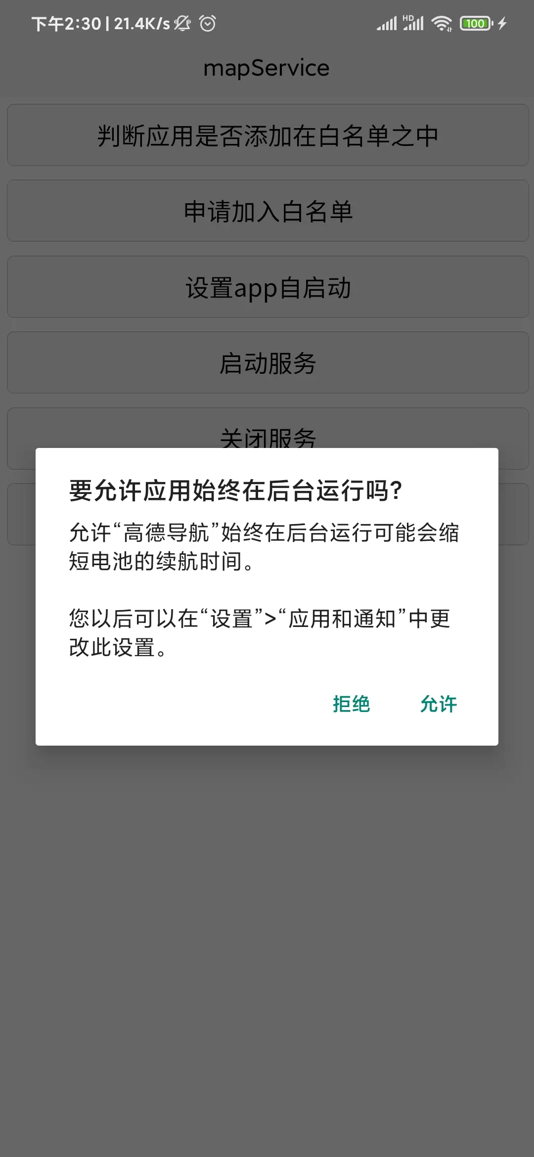 7.申请配置后台运行 申请加入白名单 自启动(先初始化启动服务)