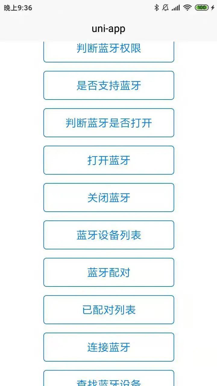 bt.findBT({"btAddress":"mac地址"},result => { //result数据:{"code":100,"msg":"连接成功"} const msg = JSON.stringify(result); console.log('蓝牙设备:'msg) }); -